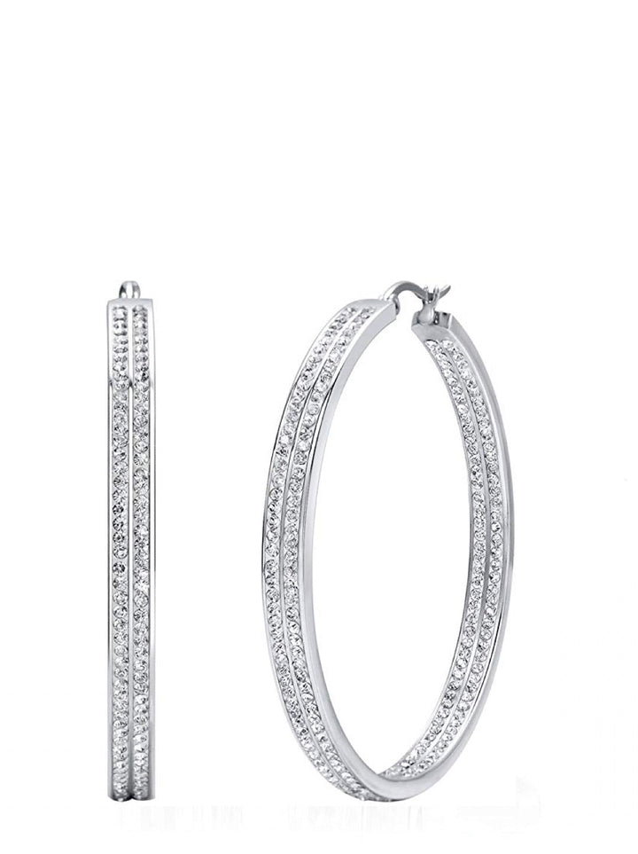 Crafted from silver-plated metal featuring embedded crystals. Hoop earrings measure 50mm in diameter.