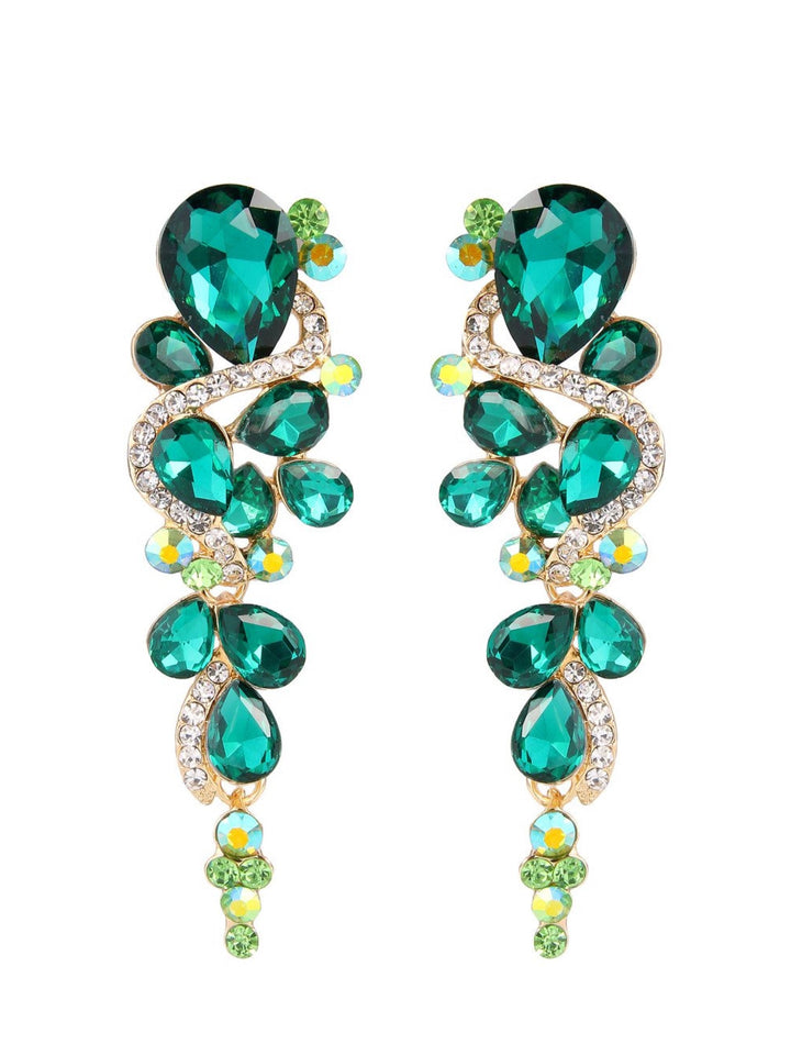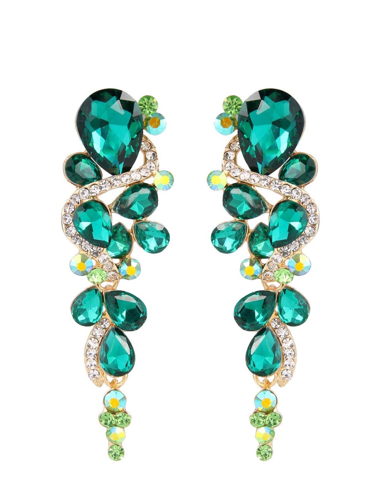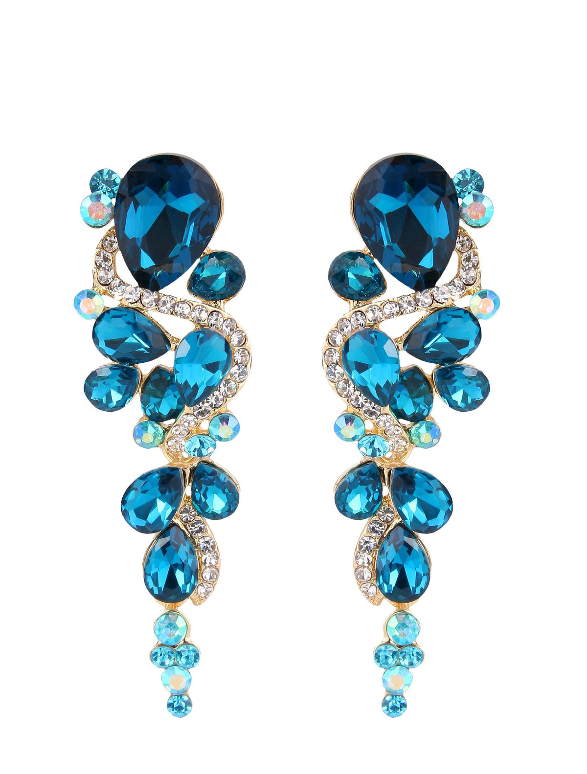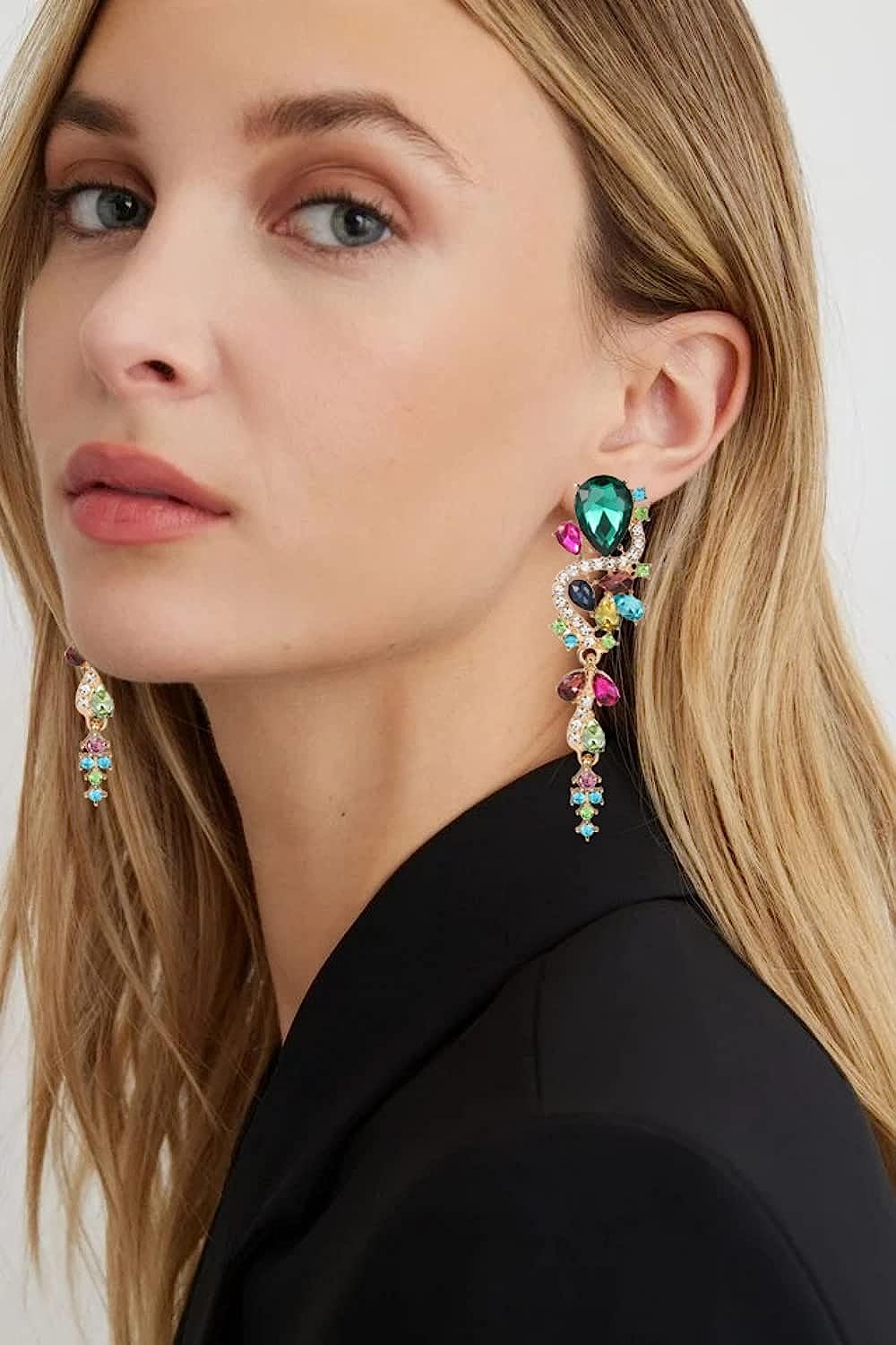 Crafted from 18K gold plating with multi-color blue-toned crystals. Earrings measure approximately 3" long.