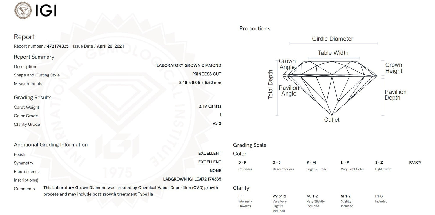 Handcrafted in solid 14k yellow gold with a 3Ct princess cut lab-grown diamond. Total carat weight: 3.19ct. Diamond clarity: VS1. Diamond color: G. IGI certificate included.