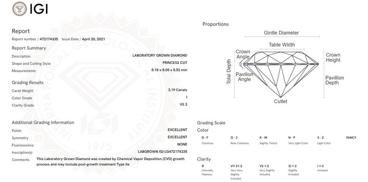 This 3.19Ct Certified Princess Cut Diamond Pendant 14k Yellow Gold Lab Grown by Pompeii3 features a 3Ct certified G color, VS1 clarity lab-grown princess cut diamond, prong set in a solid 14k yellow gold high-polished mounting. The pendant is complemented by an 18-inch chain with a spring ring clasp. The included IGI certificate ensures the diamond's authenticity, making this an exquisite and certified addition to any jewelry collection.