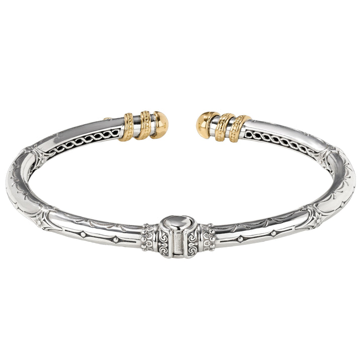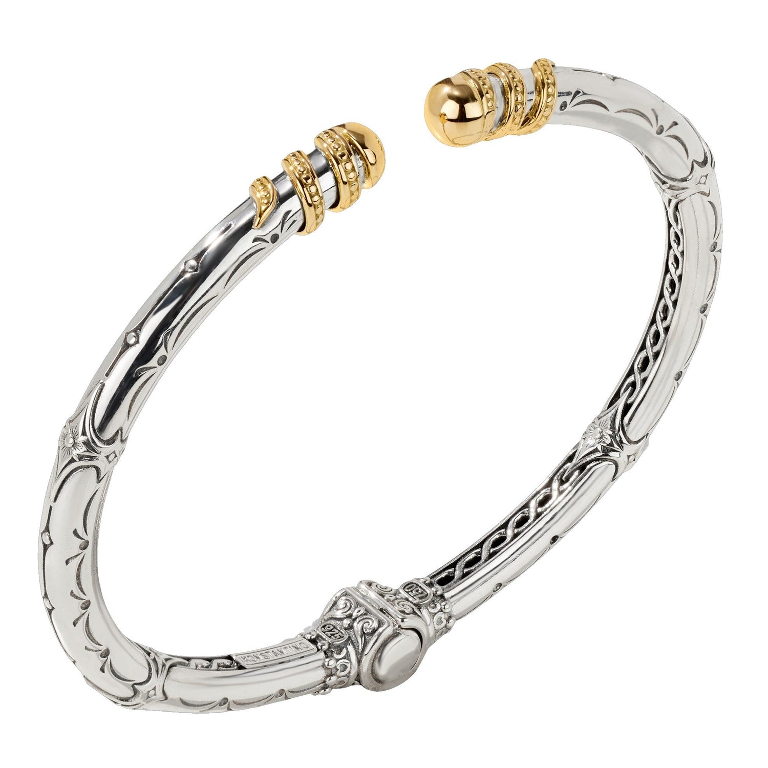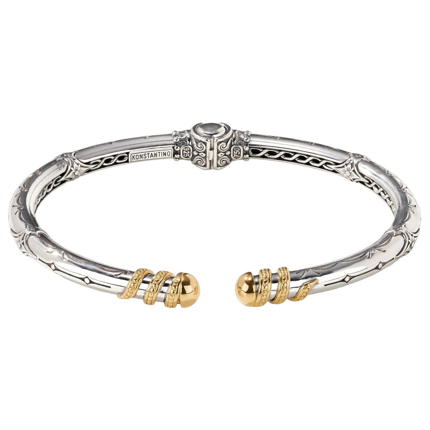 The Konstantino Anthos Sterling Silver & 18k Yellow Gold Bracelet is a beautiful hinged cuff bracelet made of sterling silver with 18k yellow gold accents. The elegant design and solid construction make this bracelet a statement piece, ideal for adding luxury to any outfit.
