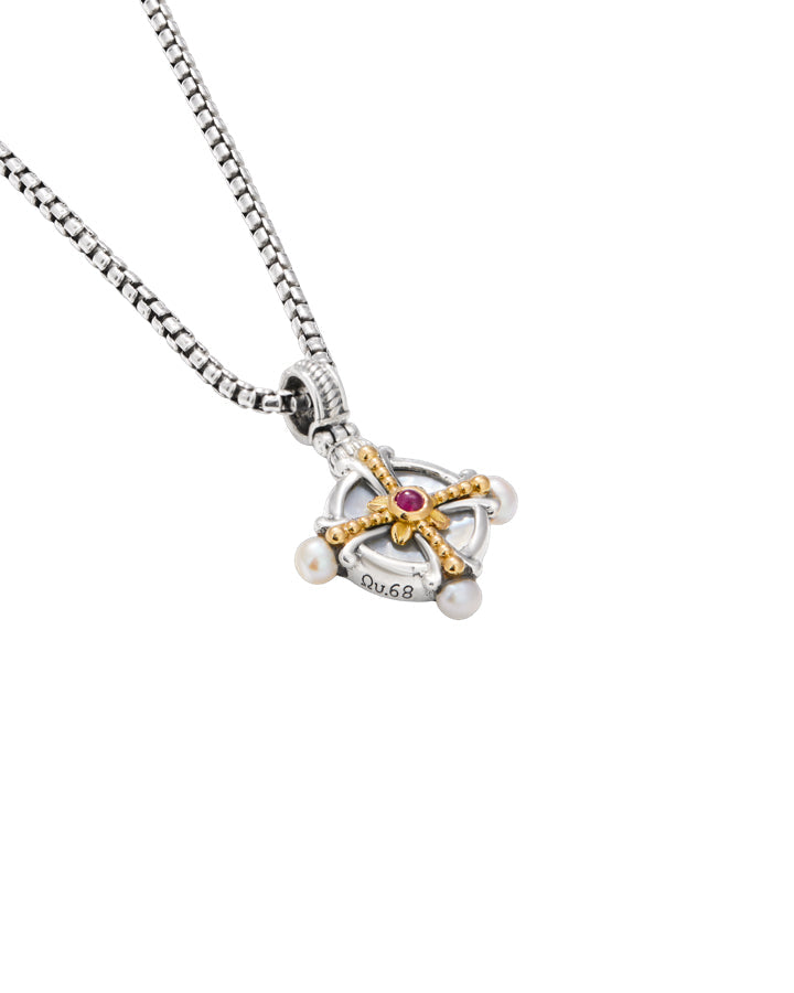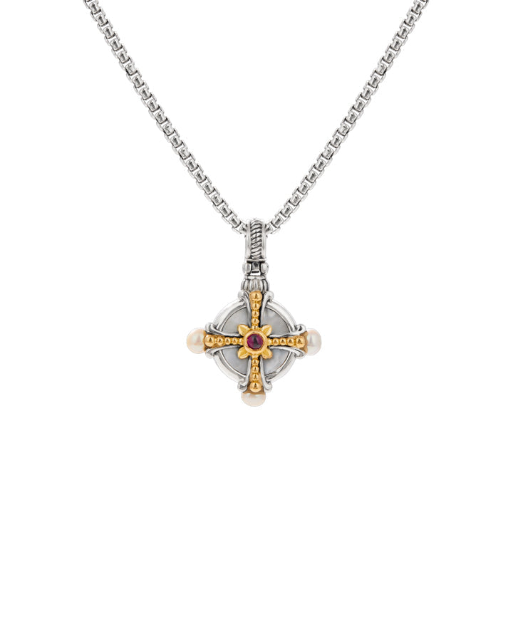 Crafted in sterling silver with 18k yellow gold accents. Mother of pearl, pearl, and ruby. Chain length: 18'-20'.