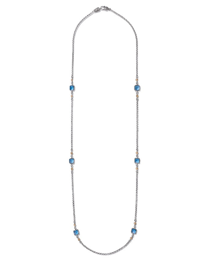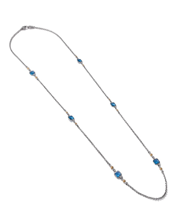 The Konstantino Anthos Sterling Silver 18k Gold Corundum Necklace is a luxurious piece crafted from sterling silver with 18k yellow gold accents, featuring stunning corundum gemstones. This 36' chain necklace is both elegant and versatile, offering timeless style and exceptional craftsmanship.