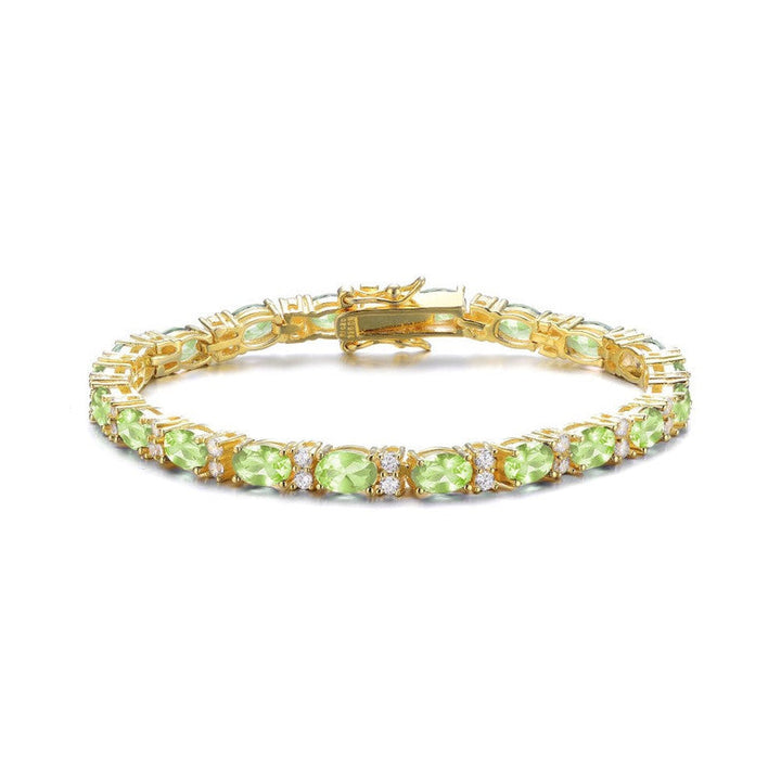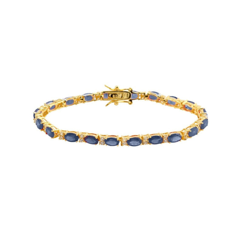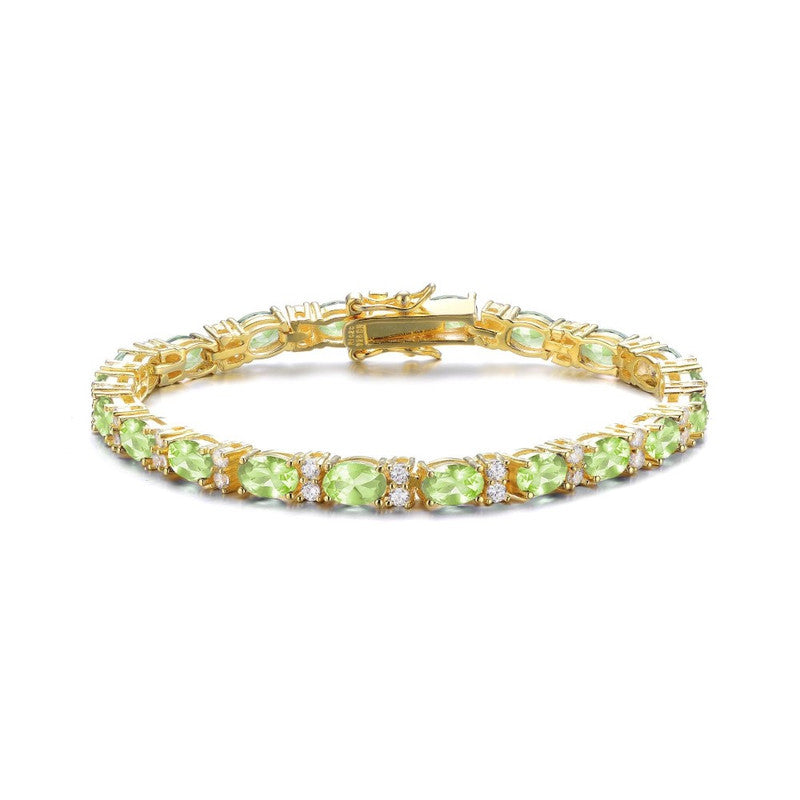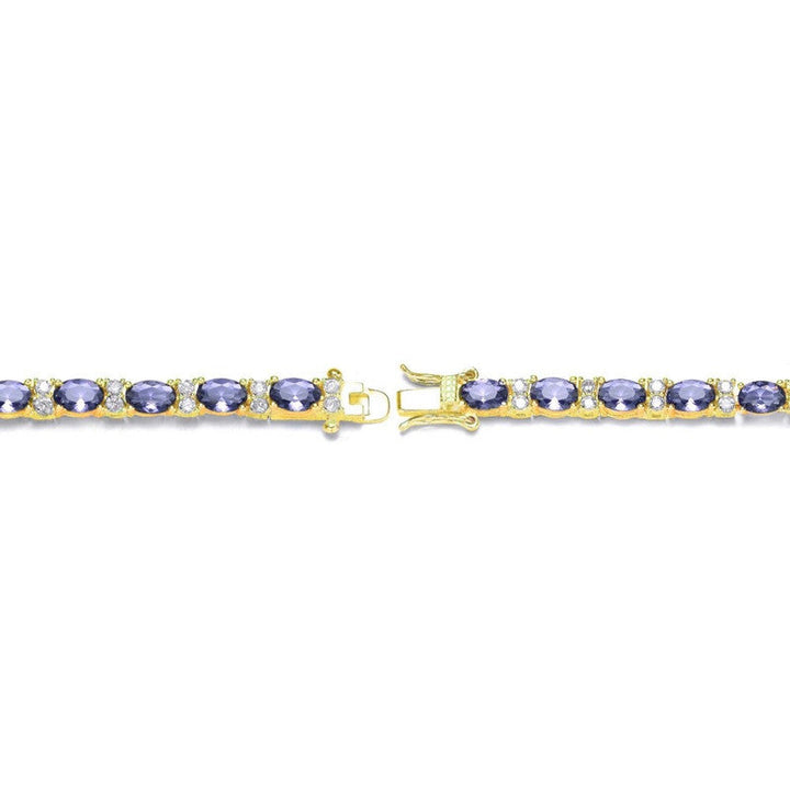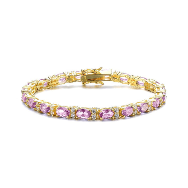 This Sterling Silver 14k Yellow Gold Plated Tennis Bracelet with Colored and Clear Oval Cubic Zirconia in Alternation by Genevive Jewelry effortlessly combines classic elegance and contemporary glamour. Expertly crafted with radiant sterling silver, this luxurious bracelet features a sophisticated 14k yellow gold plating, providing a striking backdrop for alternating oval-shaped cubic zirconia stones. Available in captivating hues including amethyst, sapphire blue, emerald green, peridot, soft pink, ruby red, and luminous clear, each color evokes personal meaning and charm, ideal for celebrating individual style and sentimentality. Timeless yet vibrant, this tennis bracelet gracefully complements any attire and occasion, making it a versatile addition to any fine jewelry collection.