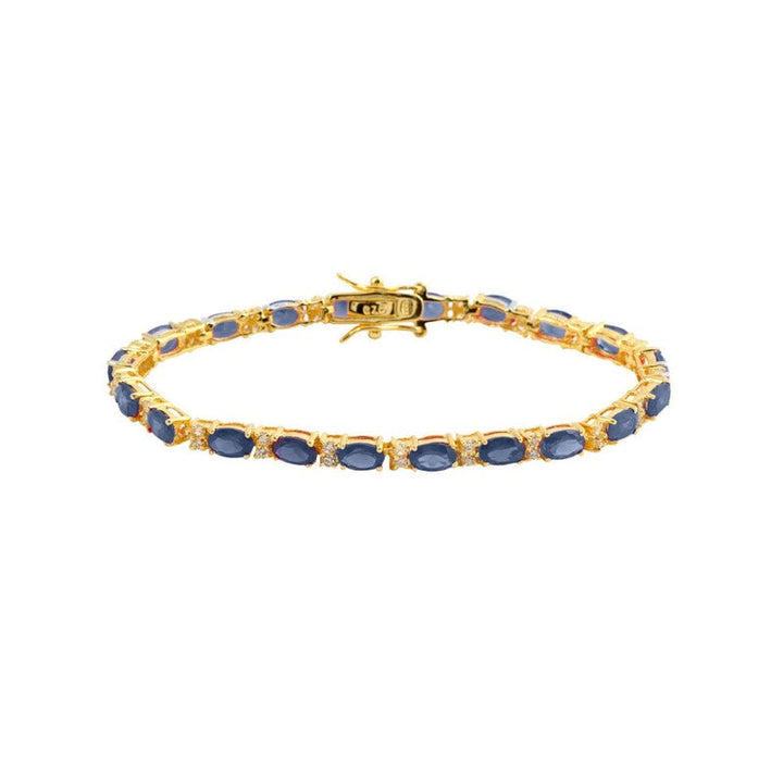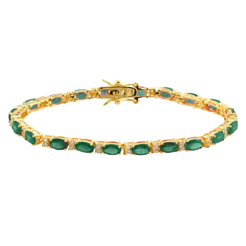 Handcrafted in sterling silver with 14k yellow gold plating, featuring alternating oval-shaped clear and colored cubic zirconia stones. Measures 7.25 inches in length.