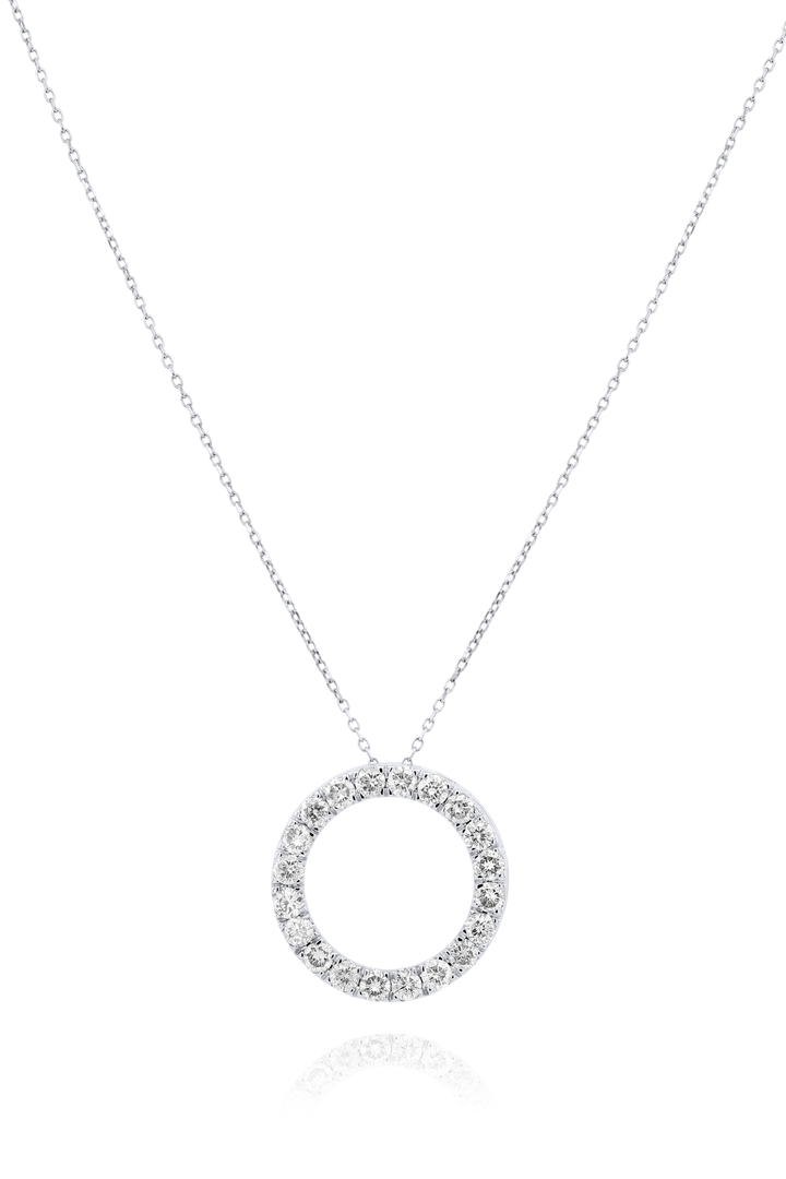 Crafted in 14kt white gold with 1.00 carats total weight of diamonds in a circle hoop pendant.