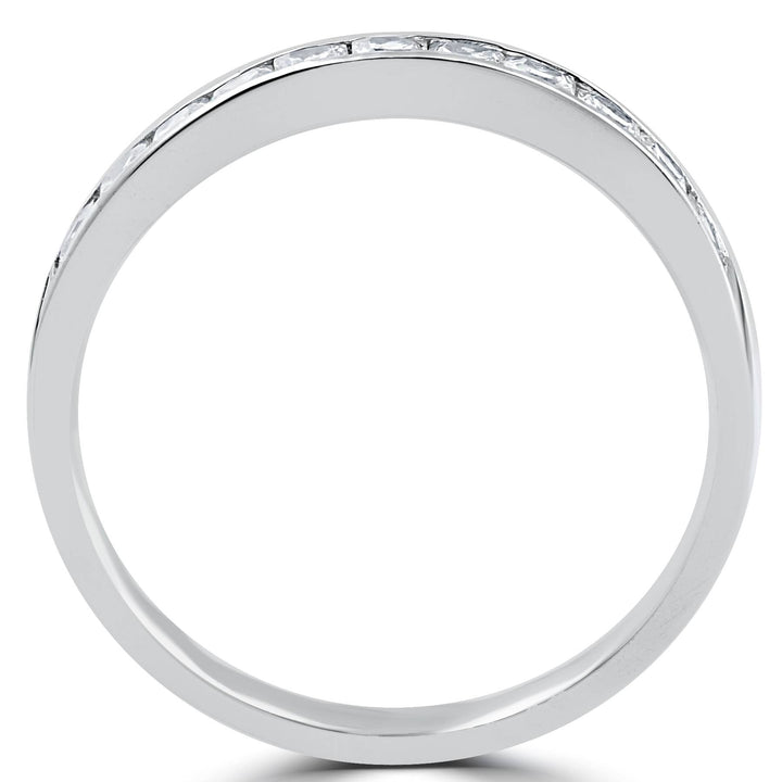 Handcrafted in solid 14k white gold with 11 princess-cut natural diamonds totaling 0.50 carats. Diamonds graded I2-I3 clarity, H-I color. Channel-set in a polished band.