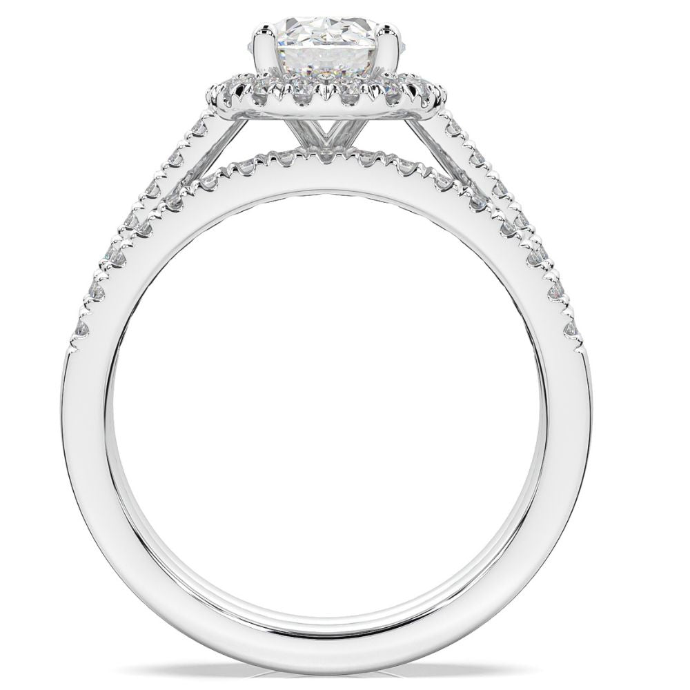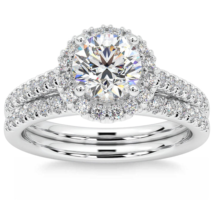 The 1 1/2 Ct Diamond Halo Engagement Wedding Ring Set 14k White Gold Enhanced by Pompeii3 offers classic beauty with a 1ct center diamond surrounded by 48 round diamonds in a halo design. This set is designed to dazzle with It's pristine diamond details, set in solid 14k white gold for a refined, timeless look.