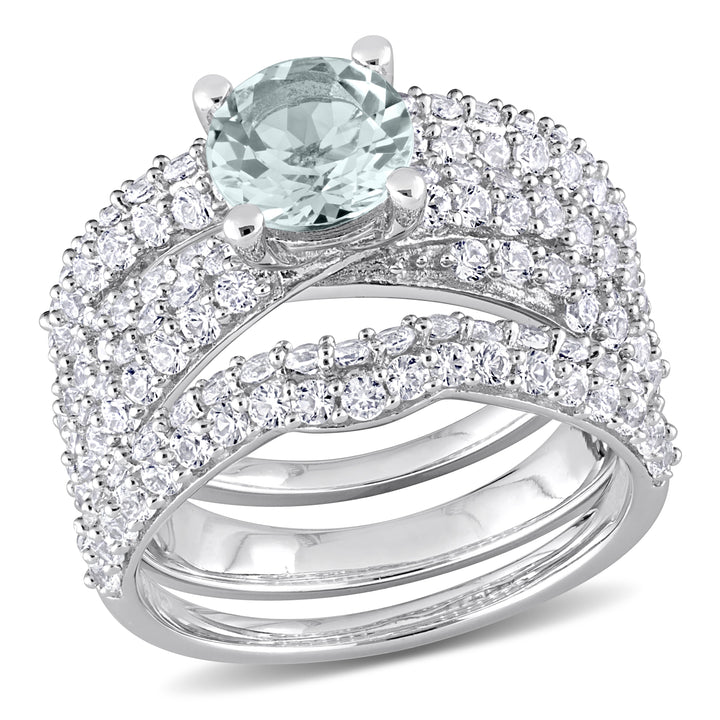 Sterling silver with 3.75 ct total gem weight featuring aquamarine and created white sapphires. Bridal set design.