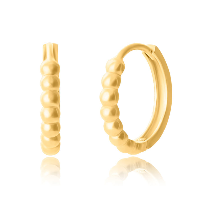 14K yellow gold with beaded huggie hoop design.