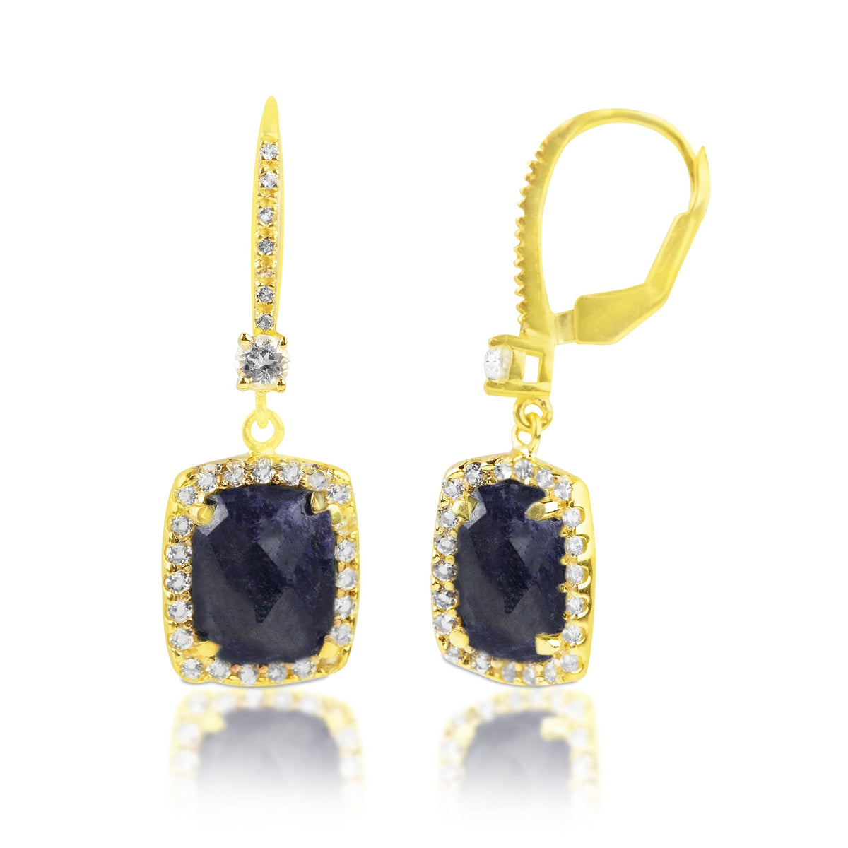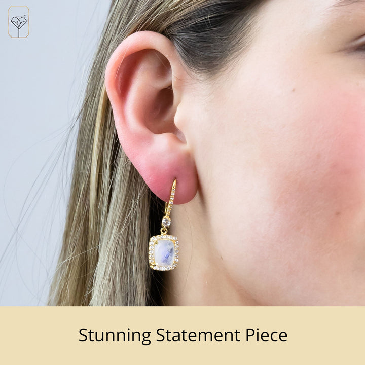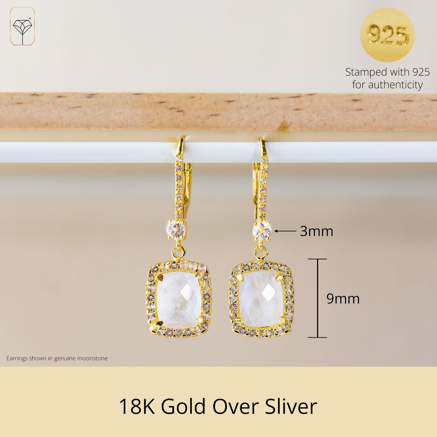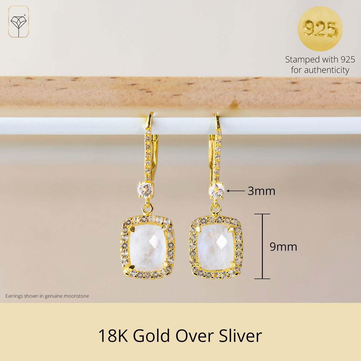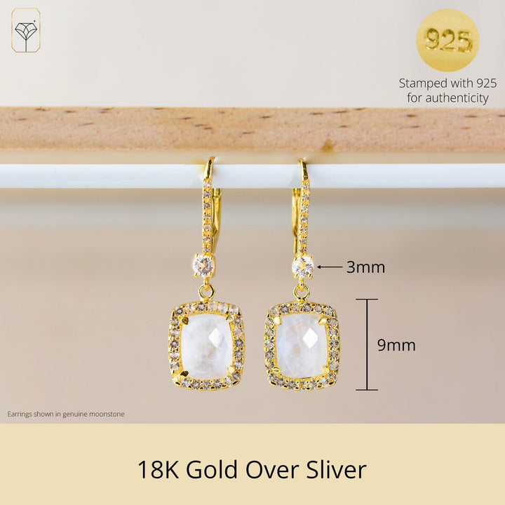 18K Gold Plated Genuine Moonstone Cushion Cut Dangle Drop Earrings With White Topaz Accents