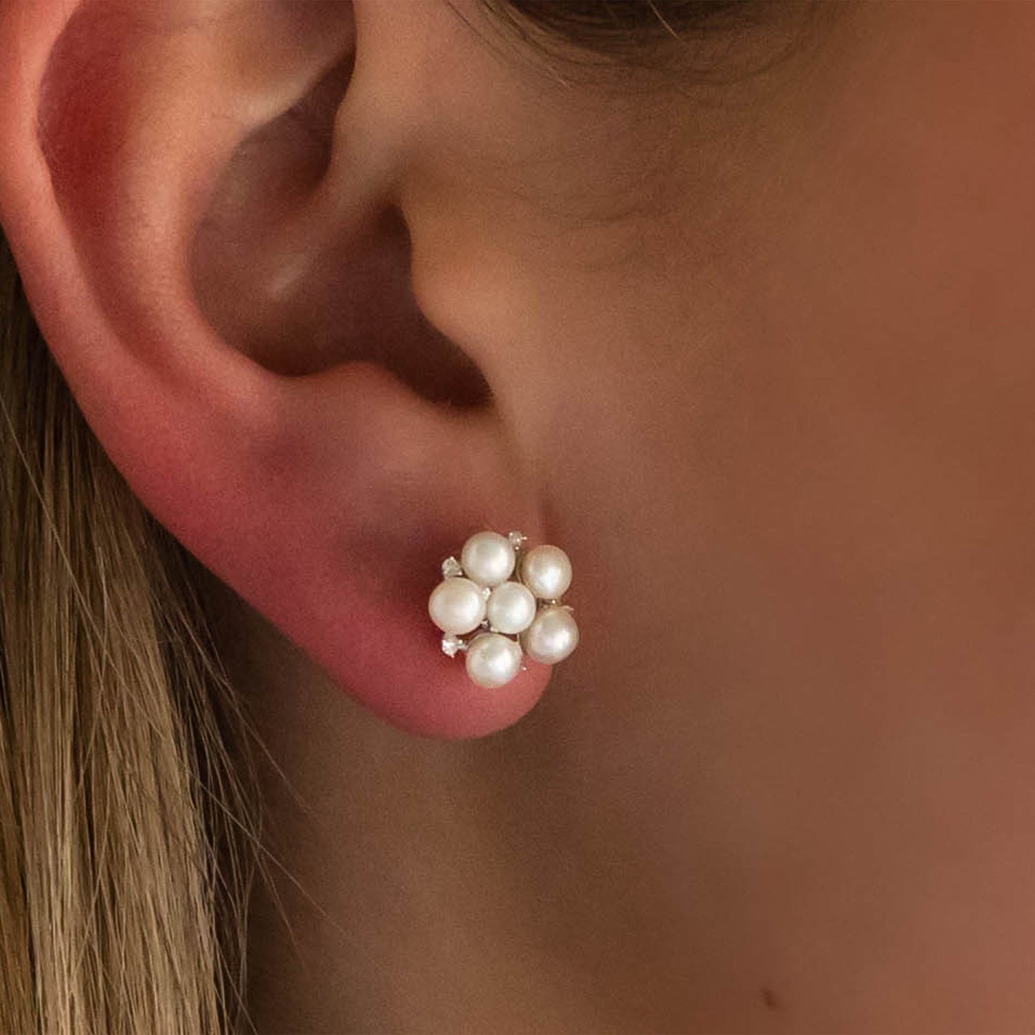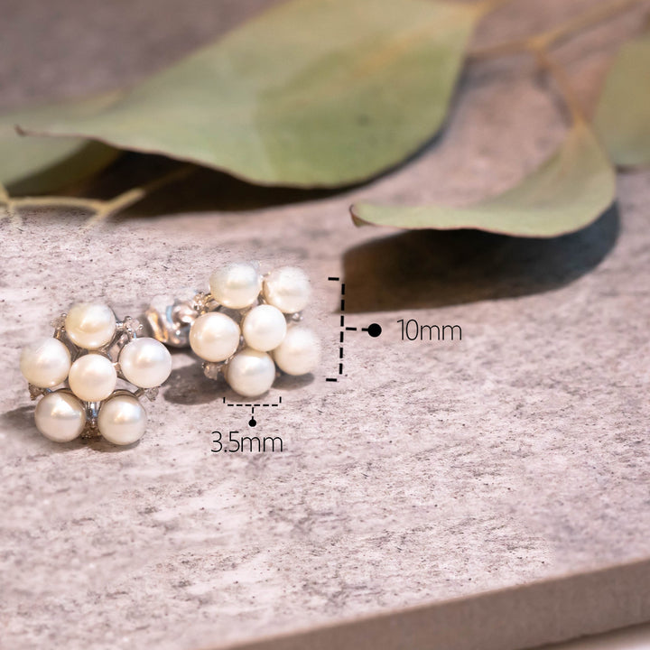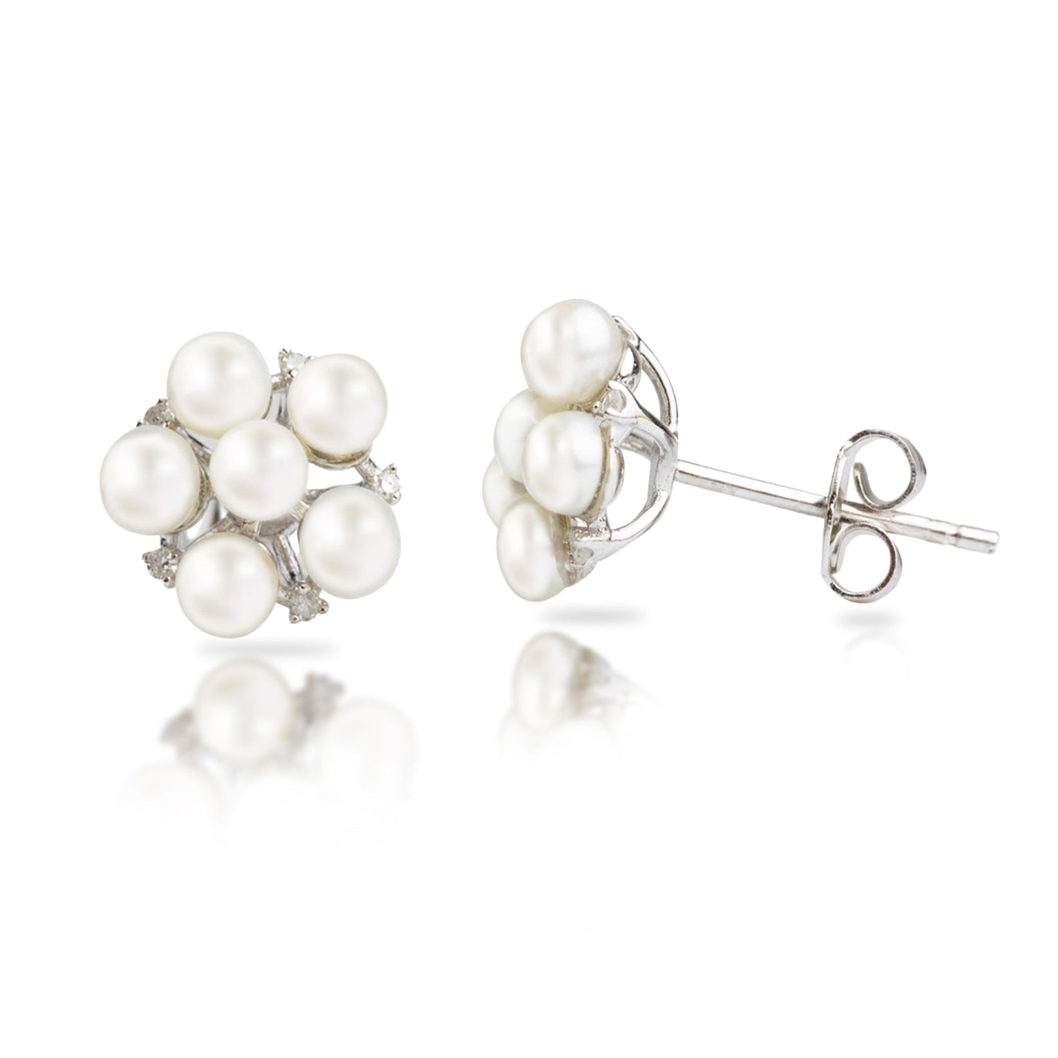 Crafted in sterling silver. Features freshwater pearls and diamond accents. Stud style with secure backs.