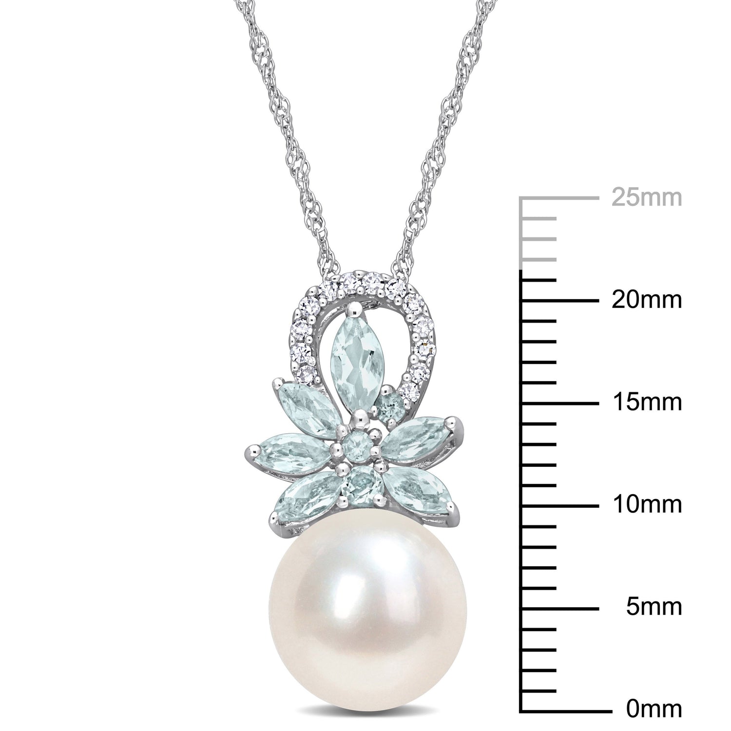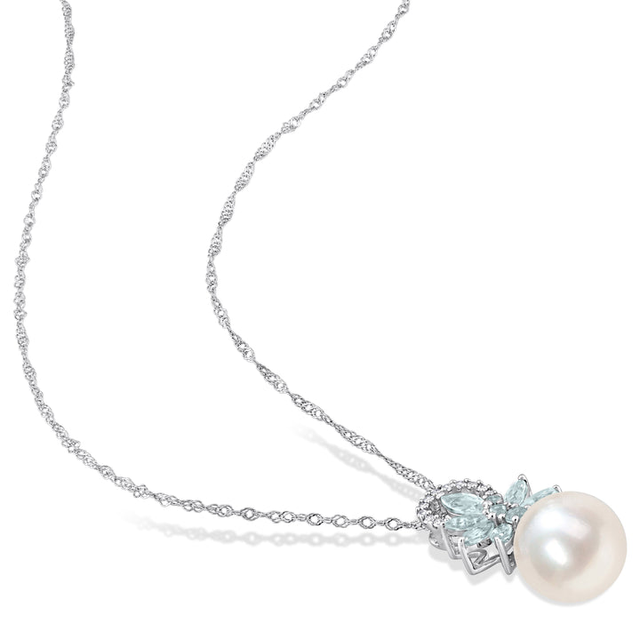Crafted in 14k white gold with a 9.5-10mm cultured freshwater pearl, aquamarine gemstones, and 13 round-cut diamonds (G-H, I1-I2). Includes a 17-inch Singapore chain.