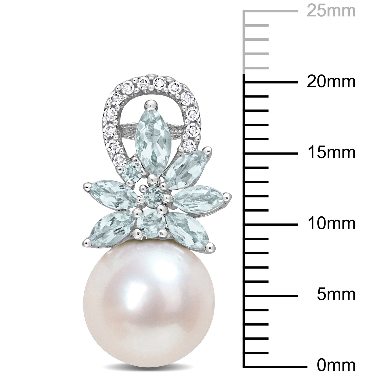 9-9.5mm Cultured Freshwater Pearl and Aquamarine and 1/8 ct TW Diamond Flower Drop Earrings in 14k White Gold