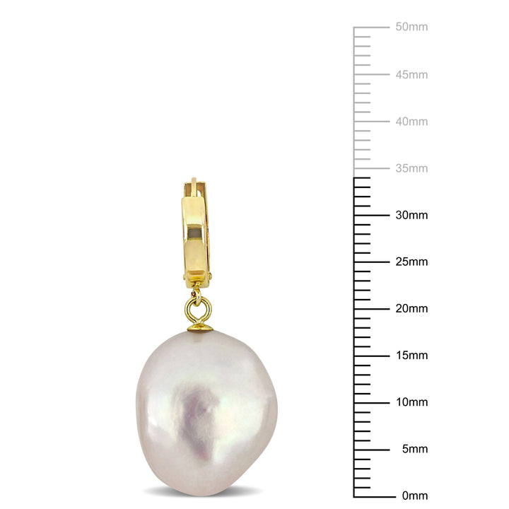 Crafted from 14k yellow gold featuring two cultured freshwater pink coin pearls, each measuring 16.5-17mm. Classic hoop-drop style earrings.