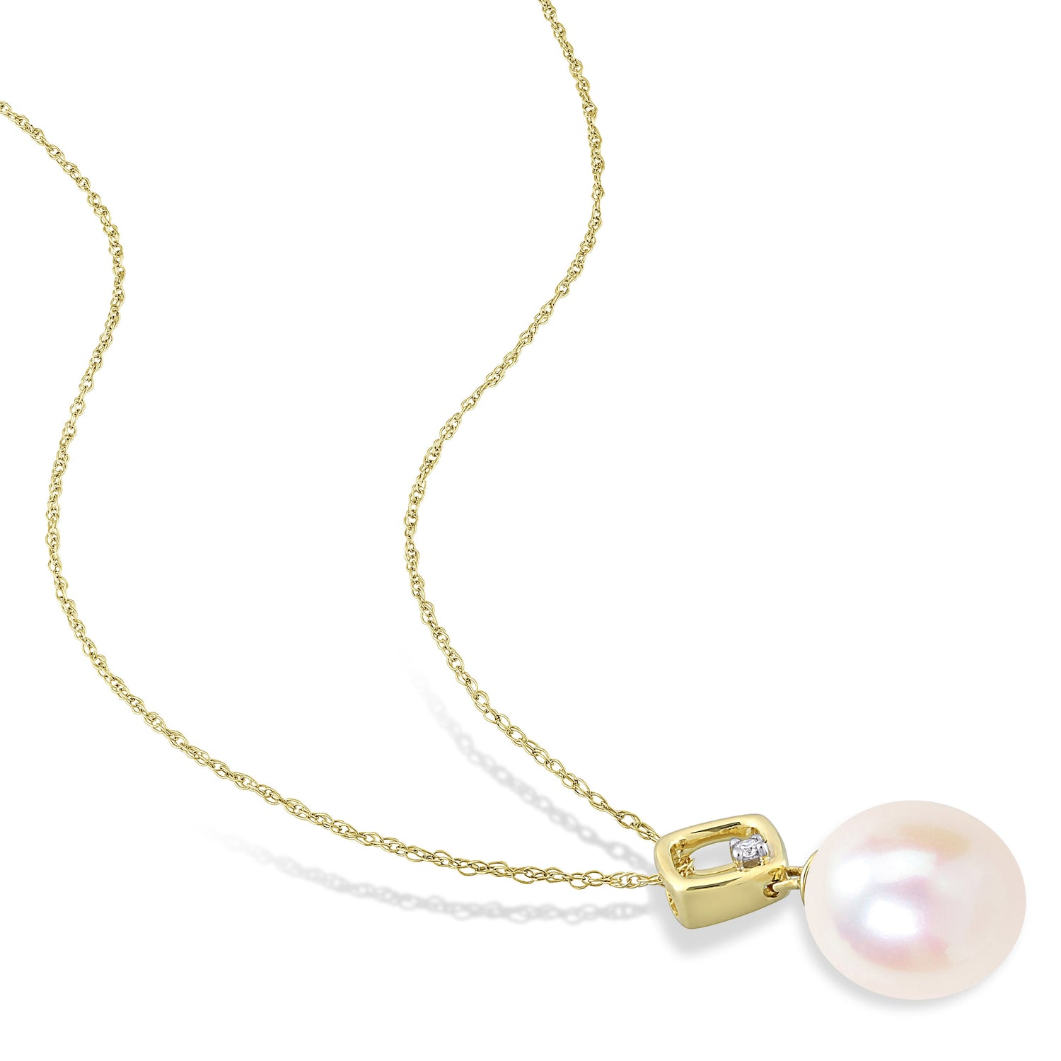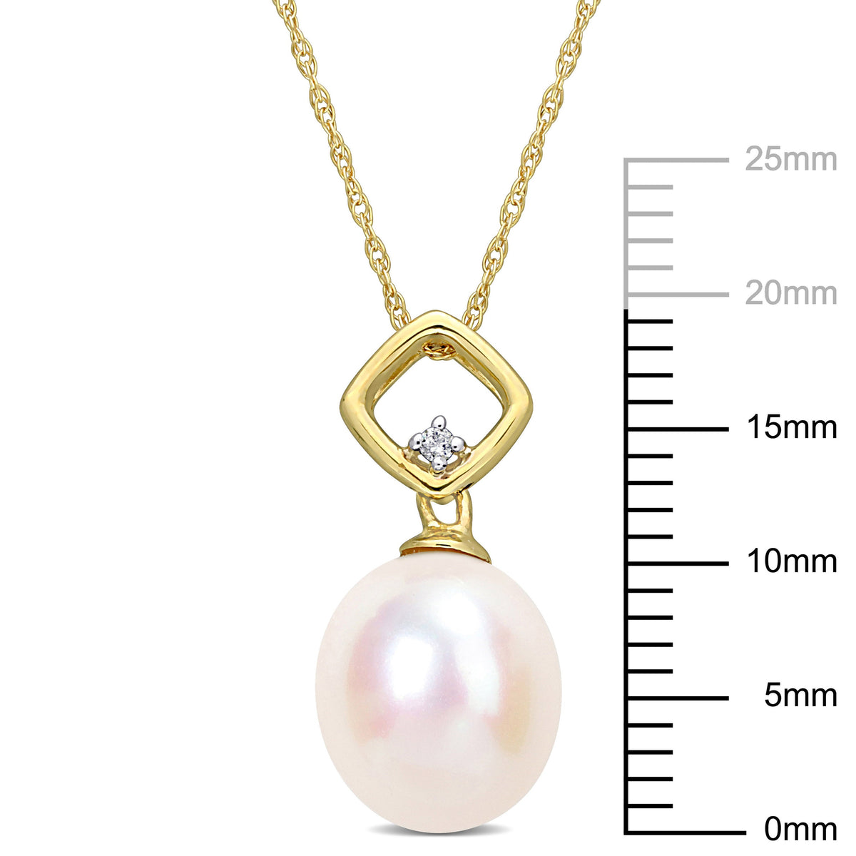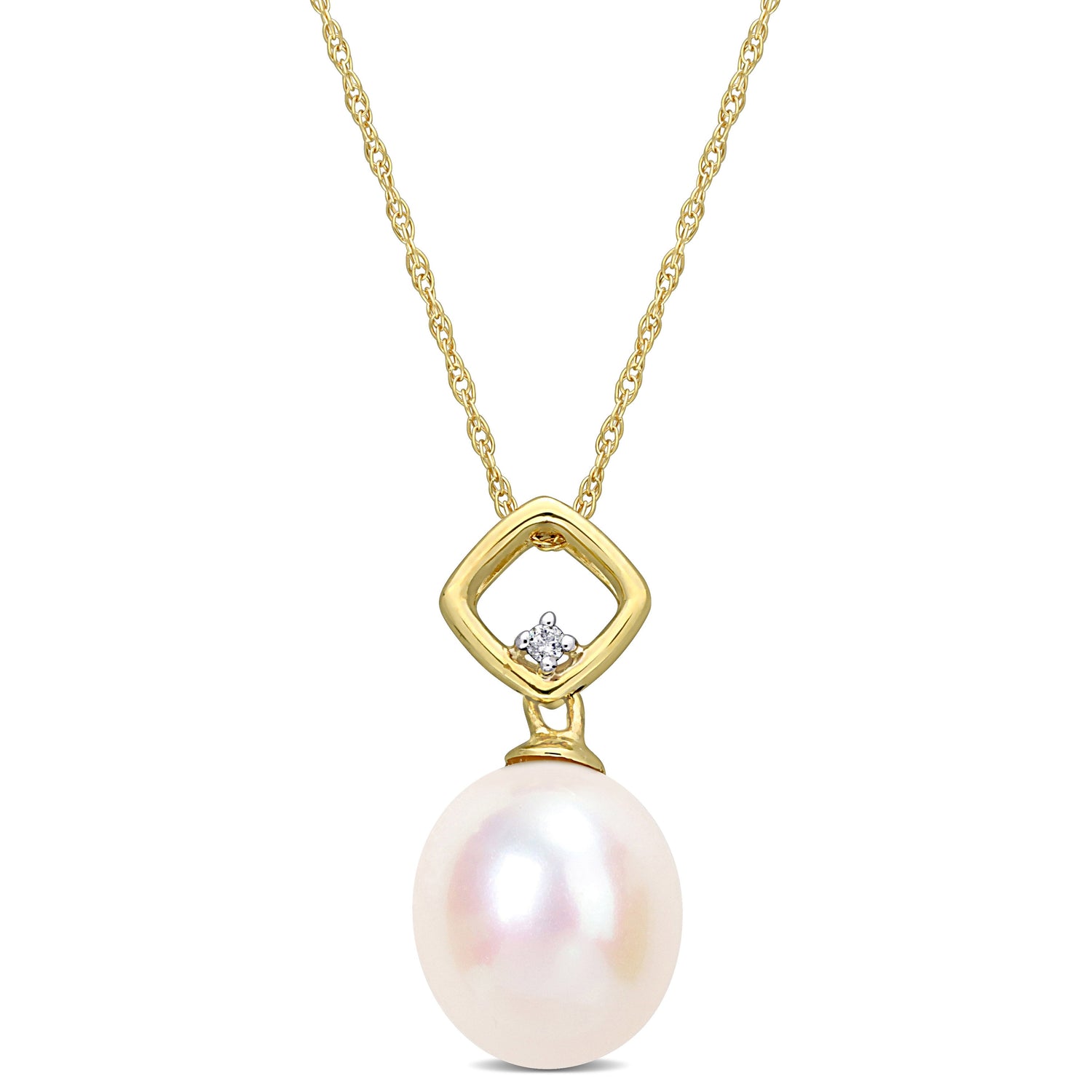 9-9.5mm Cultured Freshwater Pearl and Diamond Accent Drop Pendant with Chain in 10k Yellow Gold