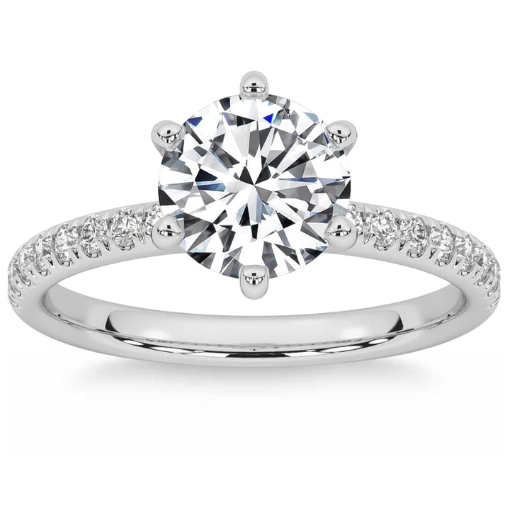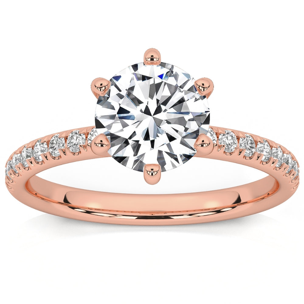 This 1.58Ct Diamond Engagement Ring by Pompeii3 is a timeless design with stunning detail. Featuring a certified 1 1/4ct lab-grown diamond flanked by round accent stones, this piece offers graceful sparkle set in polished gold with classic common prongs.