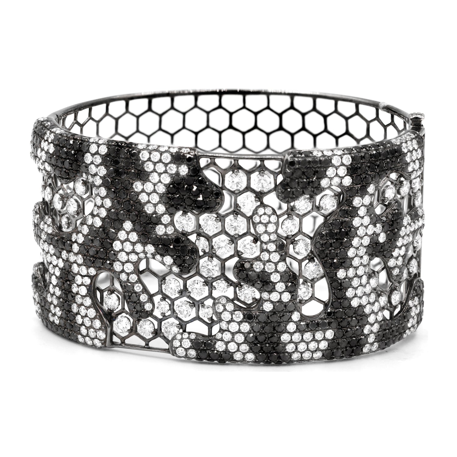 This Diamond Bangle by Diana M is a bold, artistic masterpiece. Featuring striking stripes of black and white diamonds, this luxurious piece celebrates individuality, strength, and high-end sophistication.