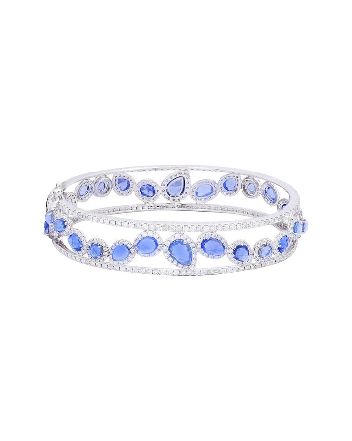 This Sapphire and Diamond Bangle by Diana M is an extraordinary statement of opulence. Crafted in 18kt white gold, it features 7.00 carats total weight of mesmerizing rose-cut sapphires, elegantly framed by 6.40 carats total weight of diamonds in a flowing, wavy design. A true masterpiece for collectors of exquisite fine jewelry.