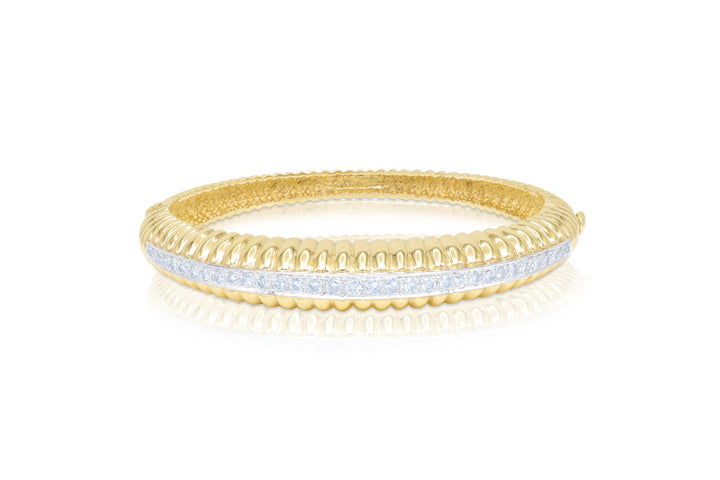 The 18kt Yellow Gold Bangle Bracelet by Diana M is a luxurious piece adorned with 1.60 carats of diamonds in a sleek and sophisticated design. The center strip of 18kt white gold accentuates the brilliant diamonds, making this bangle a true statement piece for any special occasion.