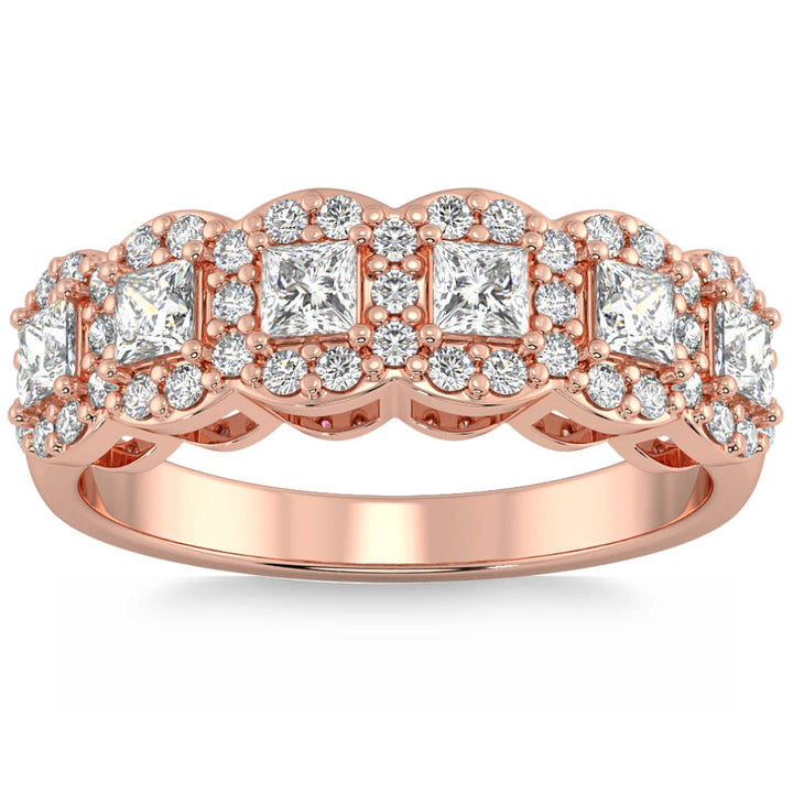This 1Ct Princess Cut Diamond Wedding Ring Stackable Band 14k Gold Lab Grown by Pompeii3 features 51 princess cut and round cut lab-grown diamonds, prong set in solid 14k gold. The diamonds are pave set, creating a continuous sparkle around the band. This elegant ring is perfect for stacking with other bands, wearing alone, or accenting your engagement ring, offering both versatility and timeless beauty.