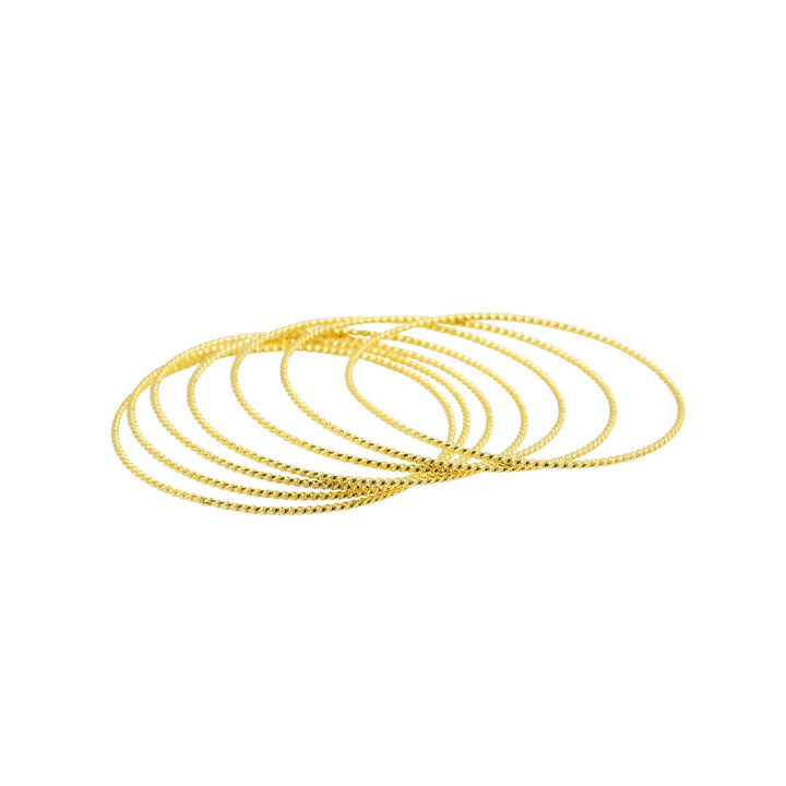 Crafted in 14k yellow gold-plated brass; set of seven bangles with a 2.5' diameter and 1mm width.