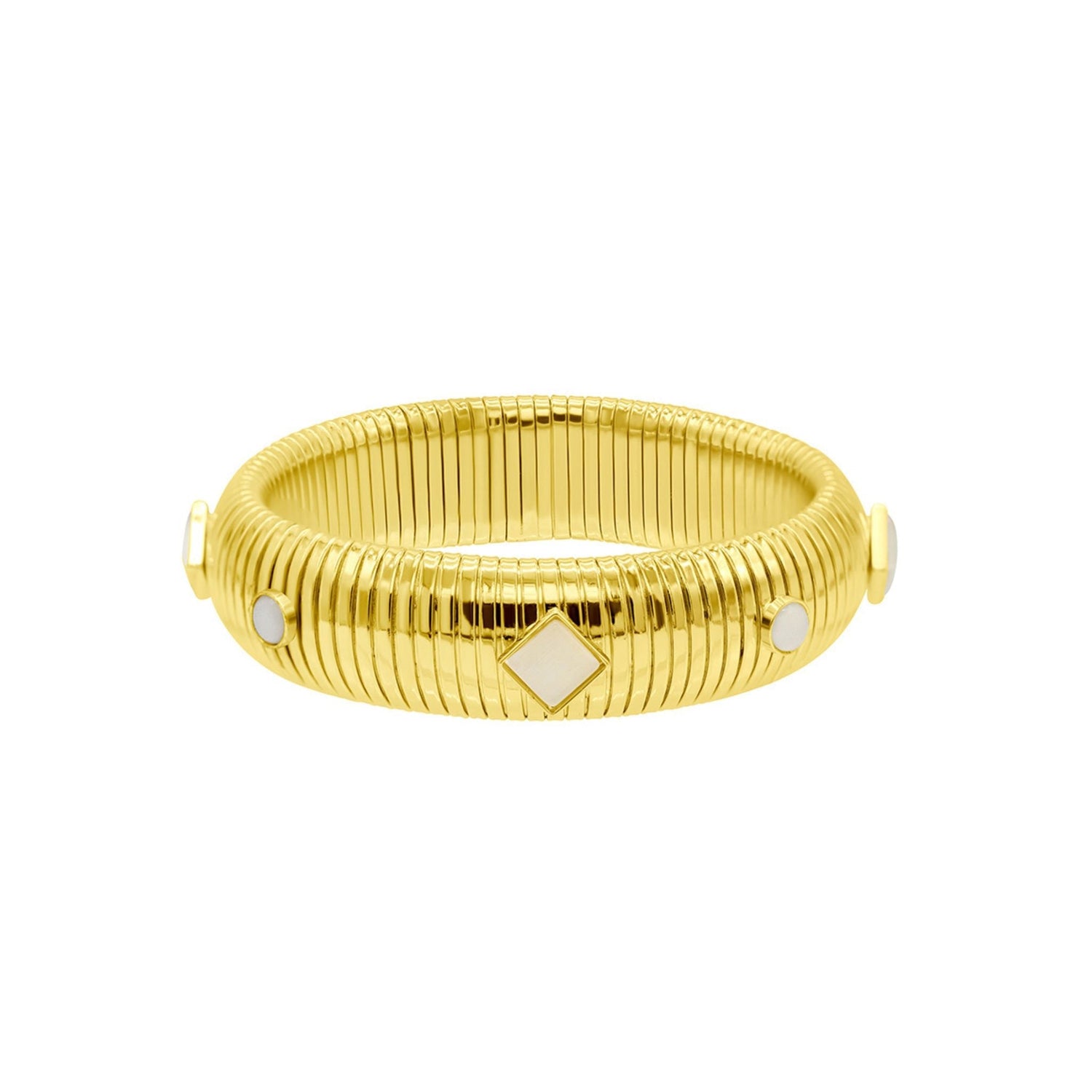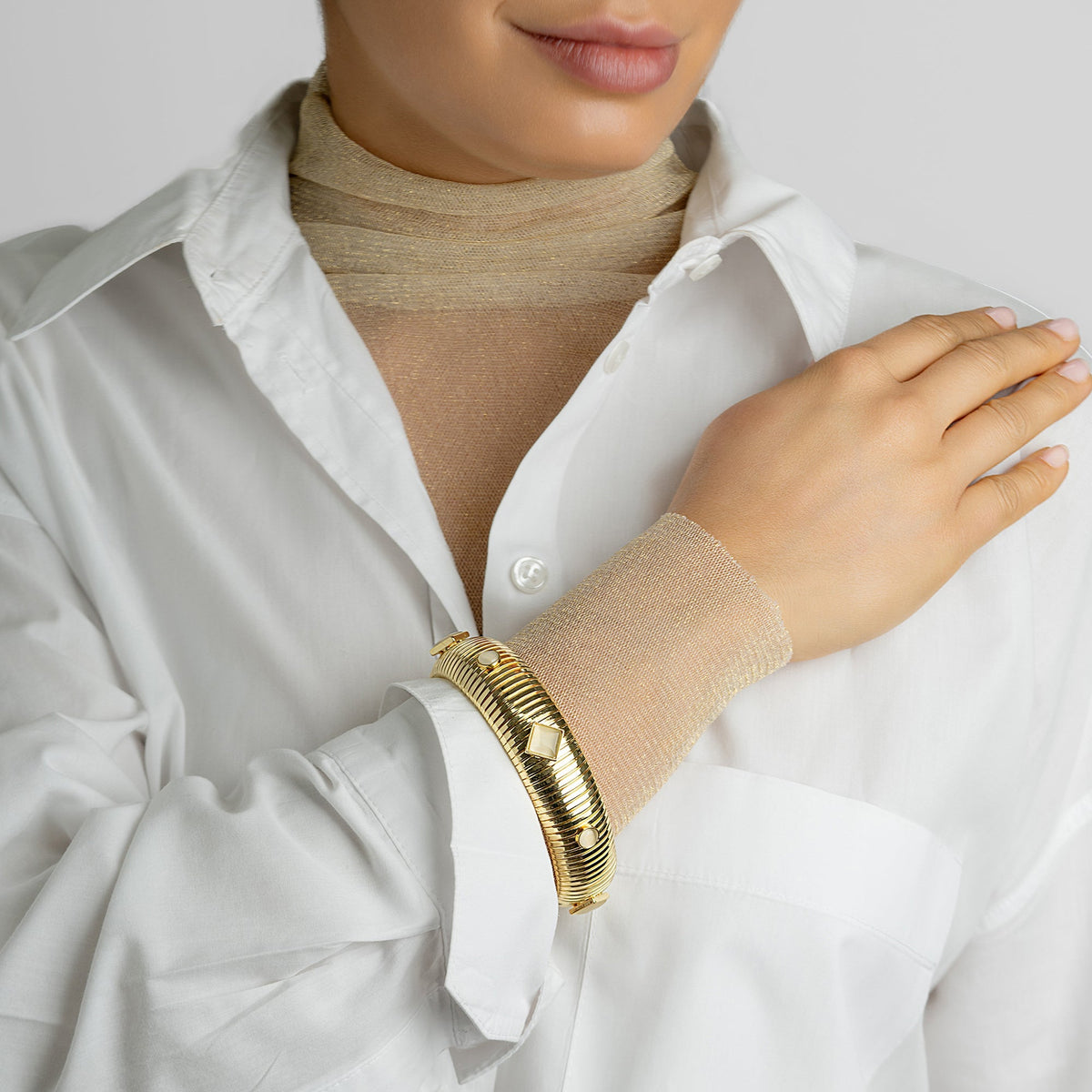 Crafted in 14k gold plated brass, .75' wide with a 2.5' diameter stretch fit.