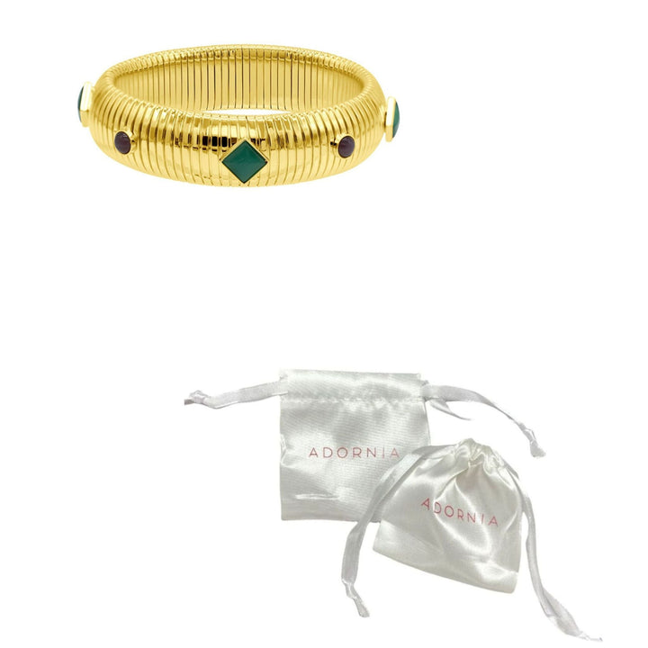 This Omega Bracelet with Color Stone by Adornia is a bold statement piece with luxurious shine. Crafted in 14k gold-plated brass with a vivid color stone accent, it adds instant glamour to your jewelry wardrobe.