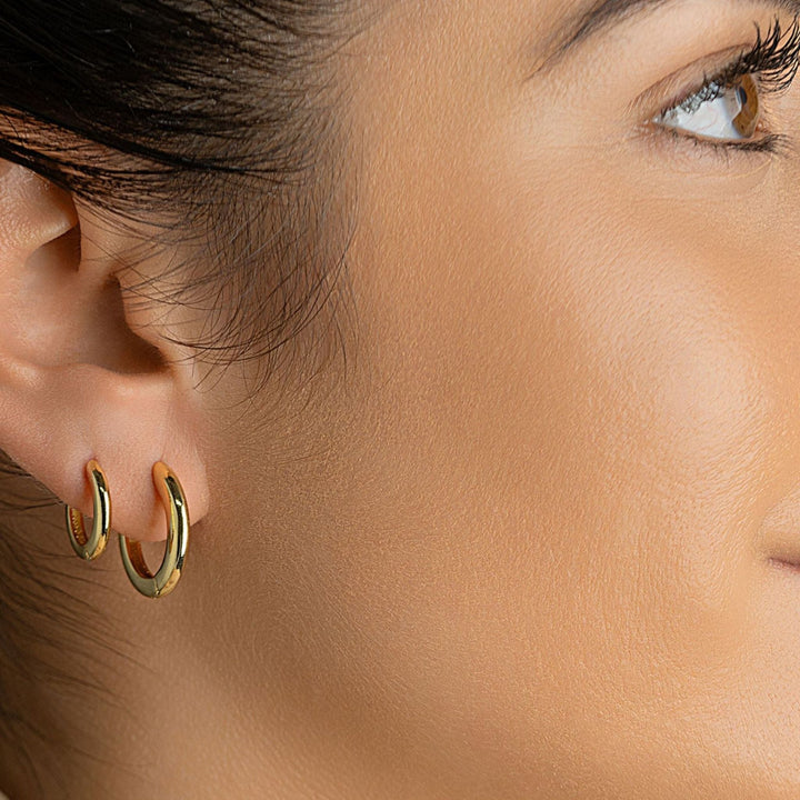 Handcrafted in 14k yellow gold plated brass. Set includes three hoop sizes measuring 0.5', 0.6', and 0.75' tall and 3mm wide. Post backs.