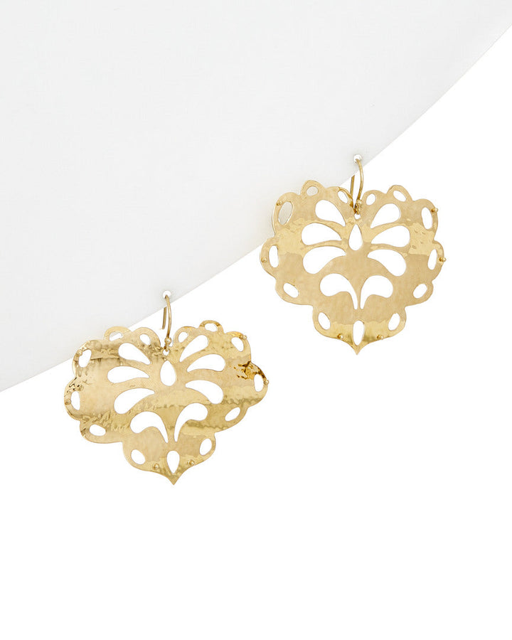 Crafted from 18k yellow gold with a filigree heart design. Earrings drop approximately 44.93mm and feature shepherd's hook backs.