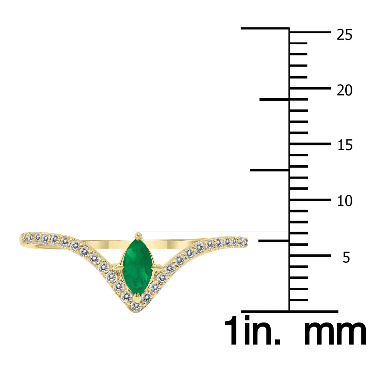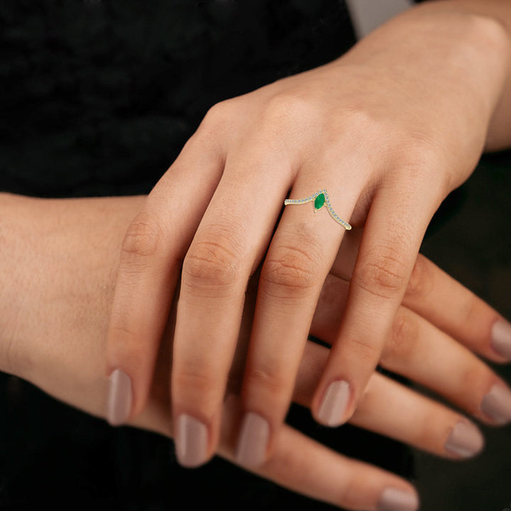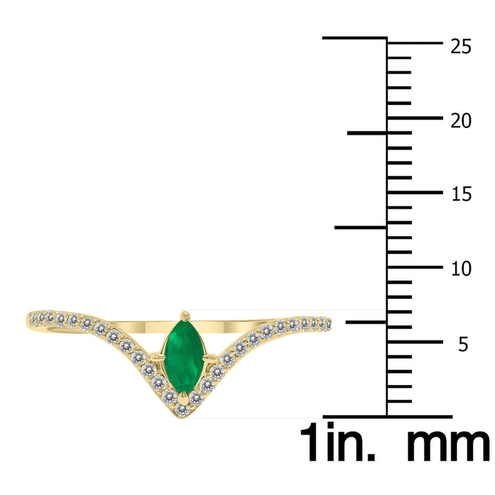 This Emerald and Diamond V-shaped Ring in 10K Yellow Gold by SSELECTS is a breathtaking piece of jewelry, featuring 1/4 CTW marquise-shaped emerald and diamonds set in a prong design. The elegant V-shaped band adds a sophisticated touch, while the brilliant emerald adds a pop of color to the overall design. This ring is a perfect choice for anyone looking to make a statement or add a colorful, luxurious piece to their collection.