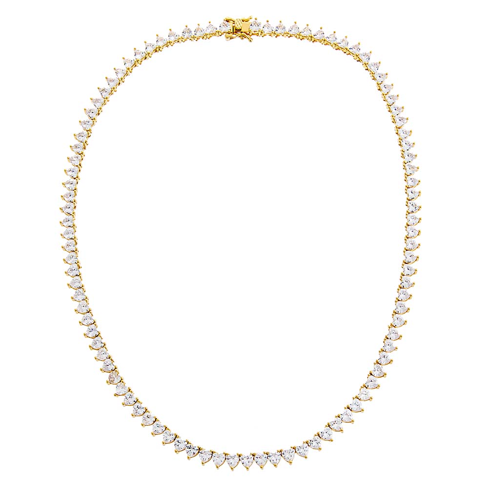 Made from brass with 14K gold plating. Features 4mm heart-shaped cubic zirconia stones. Box clasp. Length: 16 inches.