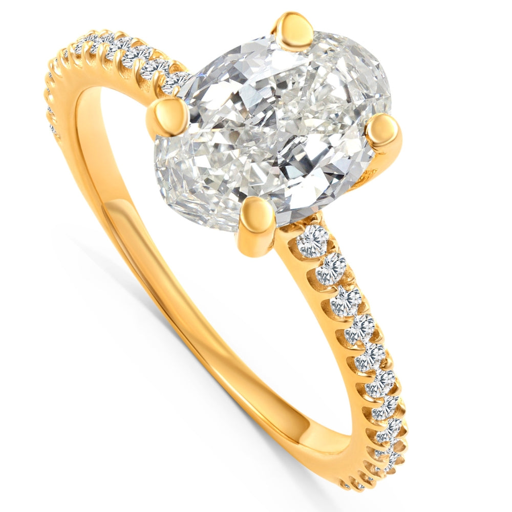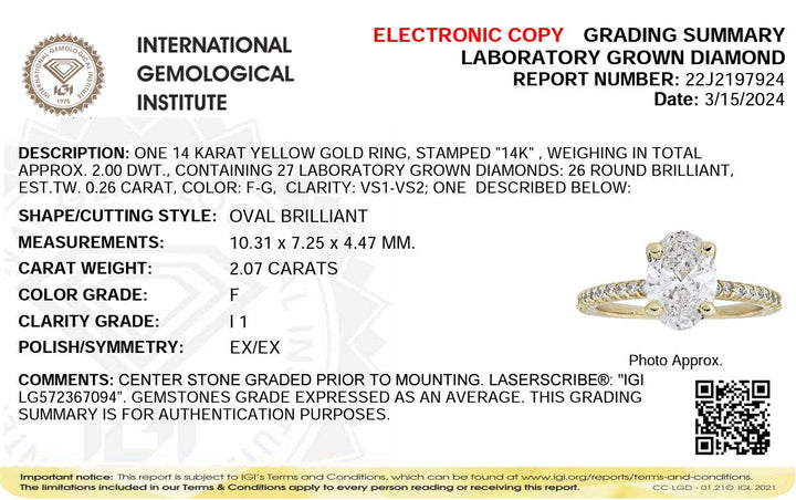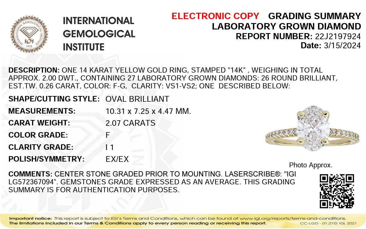 This Certified 2.33 Ct Oval Diamond Engagement Ring in 14k Yellow Gold Lab Grown by Pompeii3 features a large 2.07ct oval cut center stone, flanked by 26 round brilliant cut accent diamonds. The diamonds are prong-set in a solid 14k yellow gold polished mounting, creating a striking and timeless design for engagements. An IGI certificate is included with the diamond.