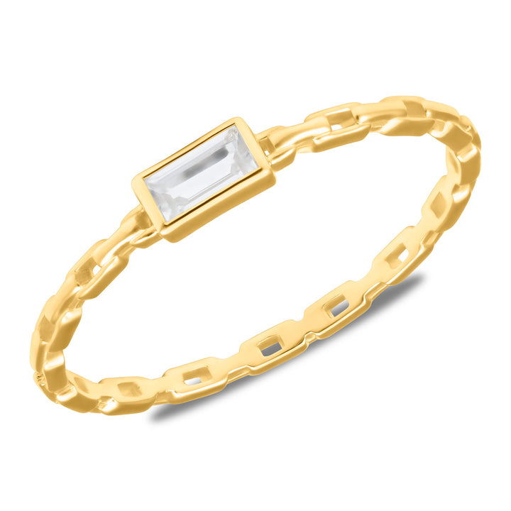 Crafted in 14k yellow gold featuring a 2x4mm baguette cubic zirconia on a 1.8mm band width.