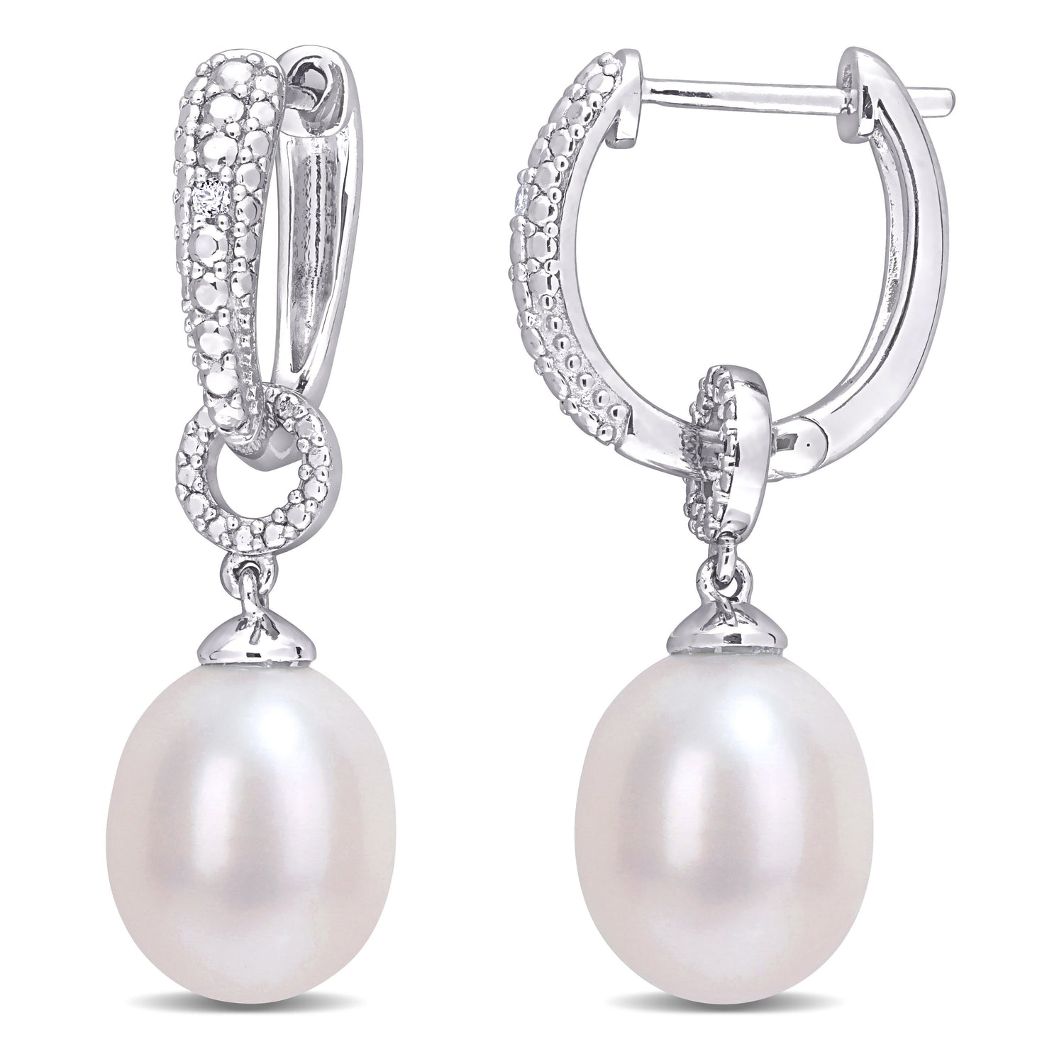 8-8.5mm Cultured Freshwater Pearl and Diamond Accent Drop Hoop Earrings in Sterling Silver