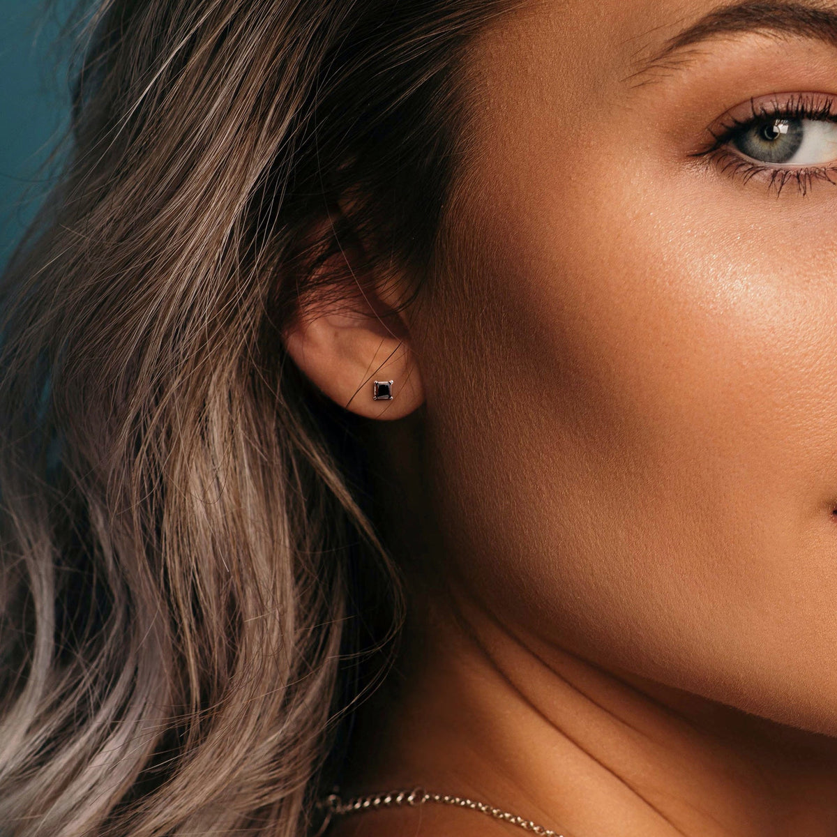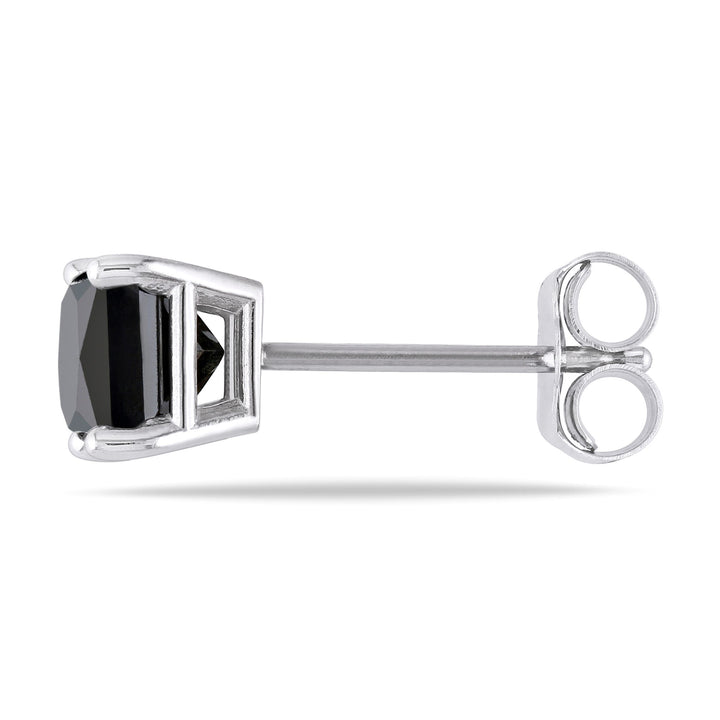 Crafted in 10k white gold with two princess-cut black diamonds totaling 1 carat. Easy-locking friction butterfly backs.