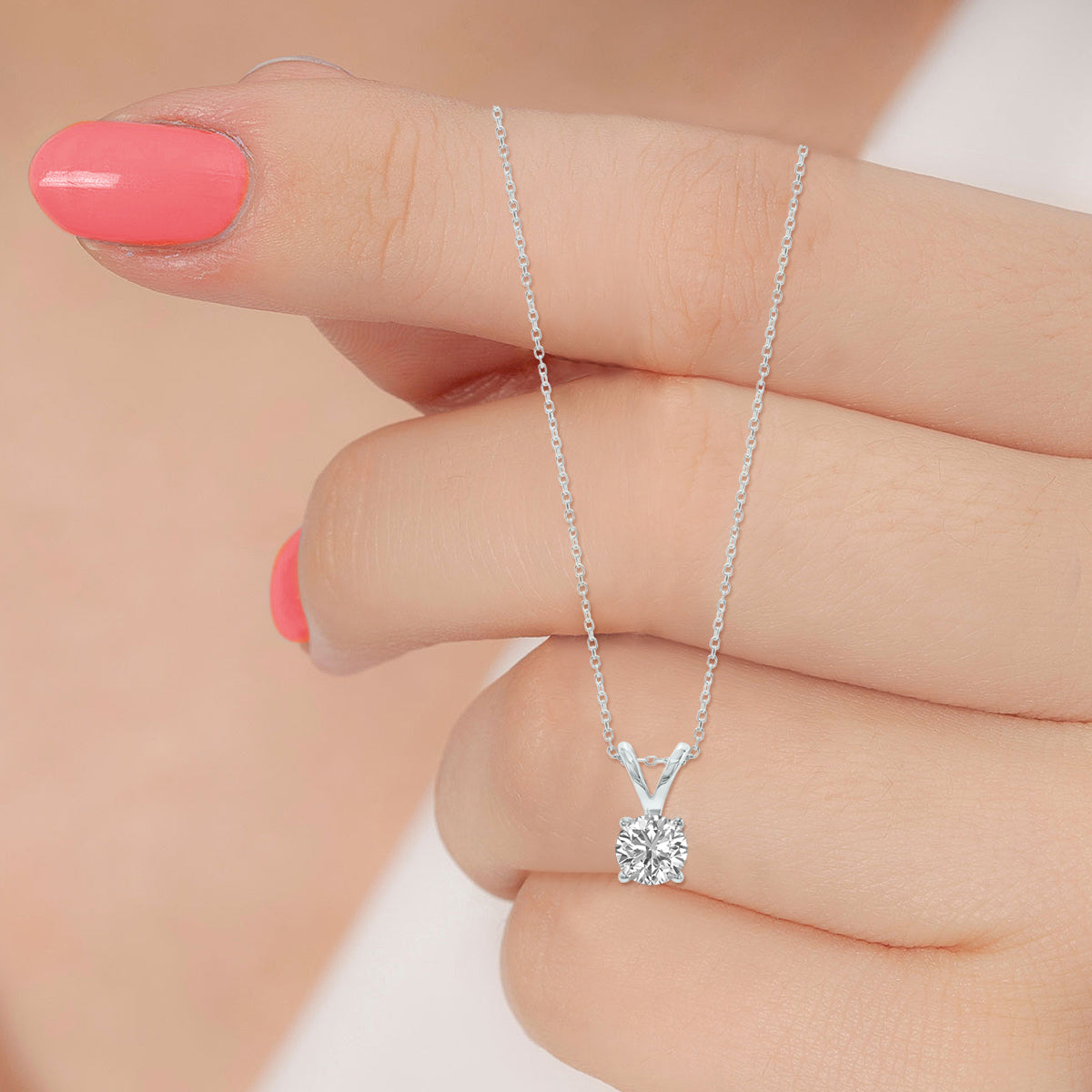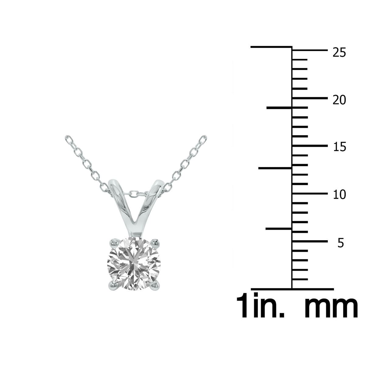Crafted in polished 14K white gold, featuring a 0.75-carat round brilliant lab-grown diamond (F-G color, VS1-VS2 clarity). Set in a 4-prong basket, pendant suspended from an 18-inch chain secured with a spring-ring clasp.