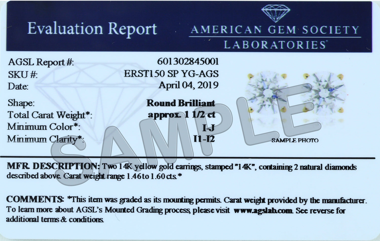 14K 1 1/2 Carat Tw Ags Certified Diamond Solitaire Earrings
