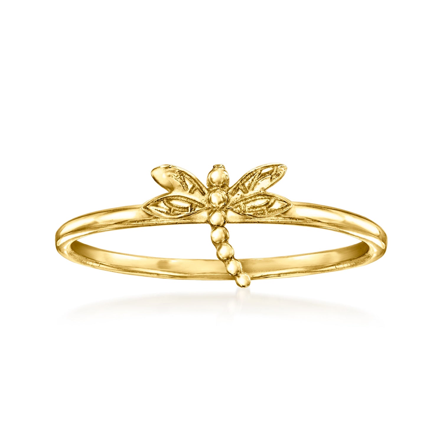 Crafted in 10kt yellow gold, featuring a dragonfly motif. Ring size 5, weighing 1.0 gram.