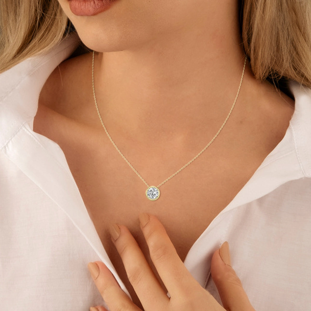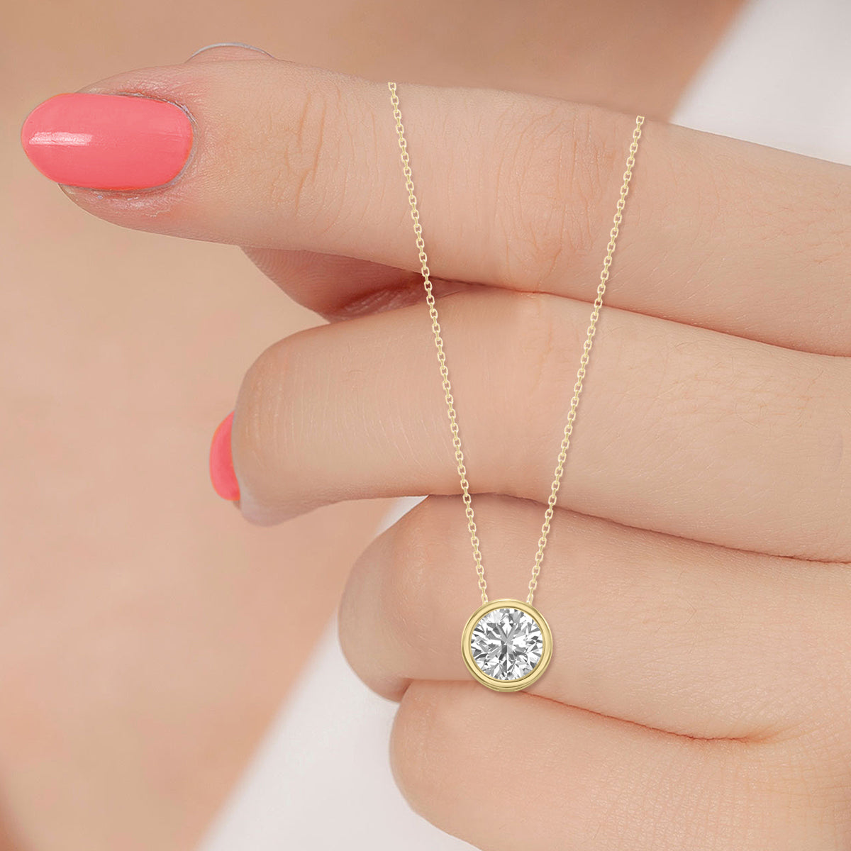 14K yellow gold with IGI-certified 2 carat lab-grown diamond. Chain length: 18 inches. Bezel setting.