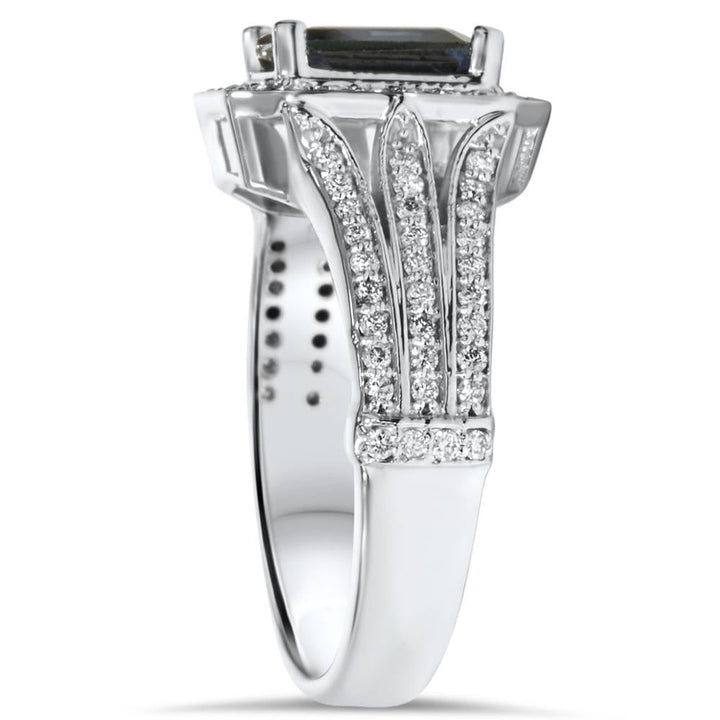 The Vintage White Gold 2 Ct Blue Sapphire & Diamond Halo Engagement Ring by Pompeii3 features a 1 1/2ct emerald blue sapphire surrounded by 84 round cut accent diamonds. Set in solid 14K white gold, this vintage-inspired ring makes a stunning statement for engagements or special occasions.