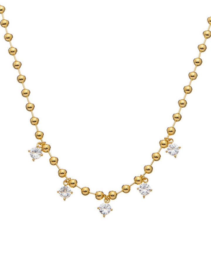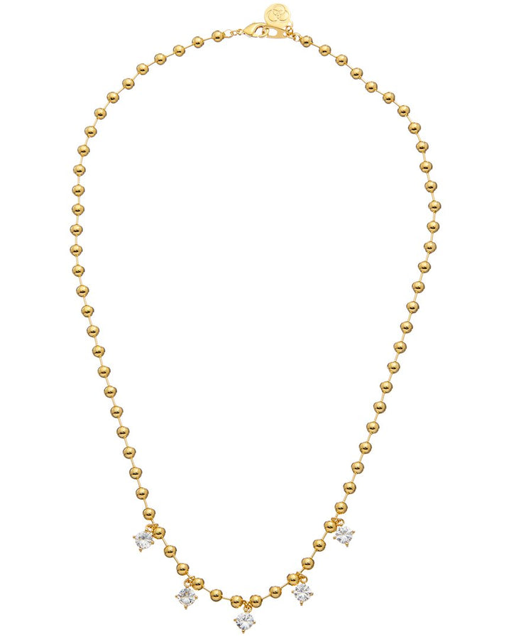 This Faith CZ Necklace by Cloverpost embodies modern elegance with a delicate sparkle. Beautifully set with shimmering cubic zirconia stones against warm 14-karat gold-plated brass, this necklace conveys subtle sophistication and timeless charm. A classic accessory designed to enhance your everyday ensembles or to add polished elegance to evening looks. It's versatile length and secure lobster clasp closure ensure comfort and effortless style. A beautiful representation of refined glamour, this Cloverpost necklace is an essential addition to your jewelry wardrobe.