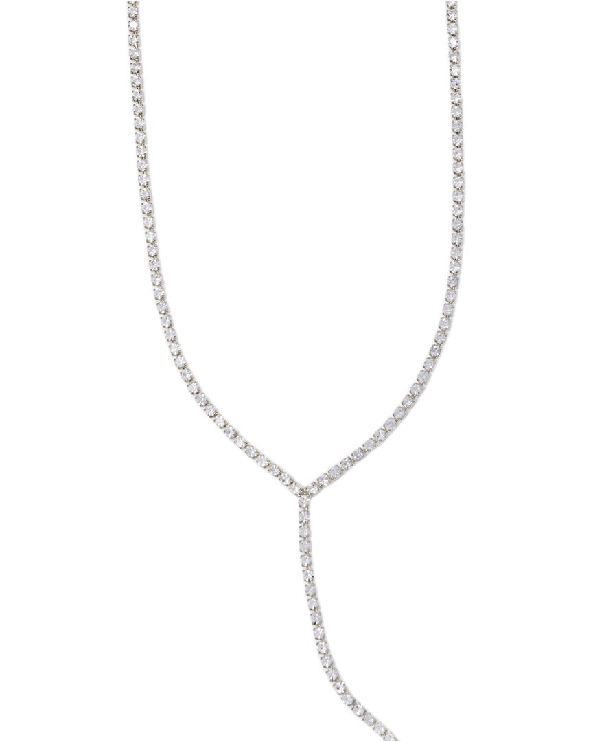 This Ryan 14K Plated CZ Tennis Lariat Necklace by Cloverpost is a sophisticated design that adds flowing elegance to any ensemble. Sparkling cubic zirconia stones set in gleaming white gold-plated brass cascade down in a graceful drop, accentuating the neckline with effortless chic. Perfect for layering or standalone glamour.