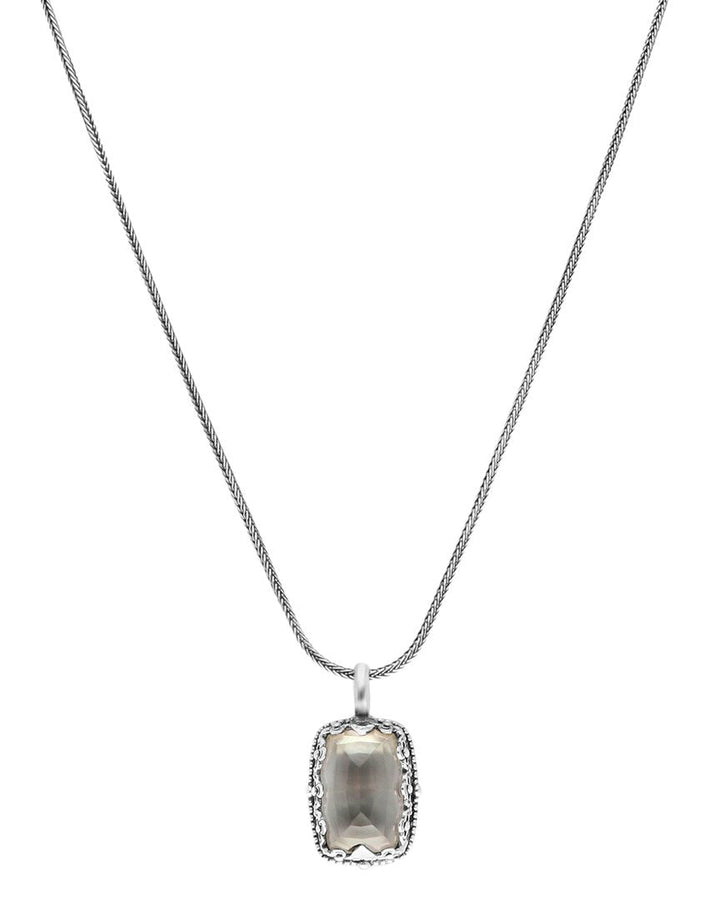 This Silver Pearl Necklace by Konstantino celebrates Greek craftsmanship with It's hand-crafted design in sterling silver, adorned with luminous mother-of-pearl and rock crystal accents. It exudes timeless elegance and sophistication, making it a standout statement piece that seamlessly elevates any ensemble.