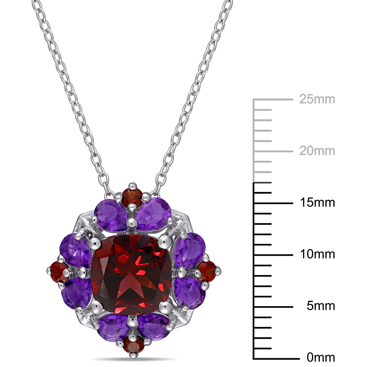 Crafted in sterling silver with 4 2/5ct total gemstone weight. Features 1 cushion-cut garnet (8x8mm), 4 round-cut garnets (2.25x2.25mm), and 8 pear-cut African amethysts (4x3mm). 18-inch cable chain with spring ring clasp.