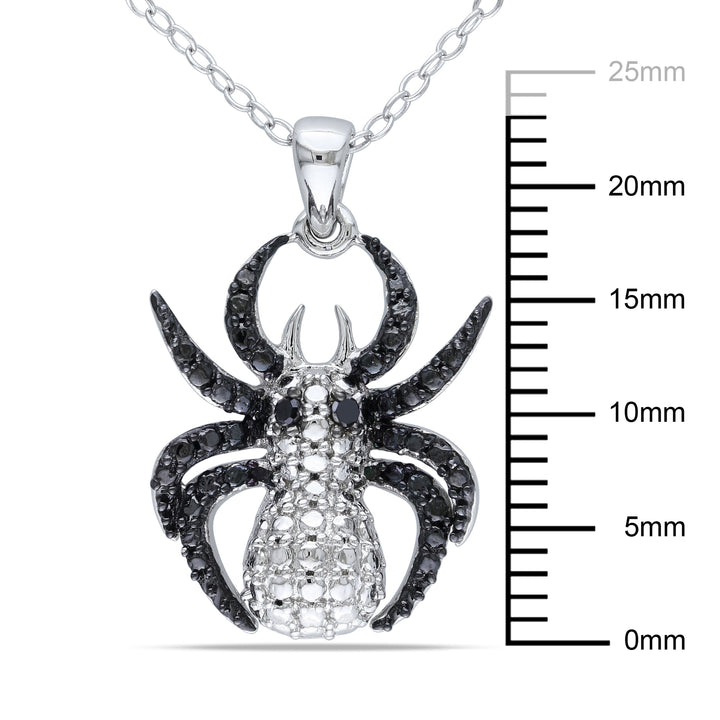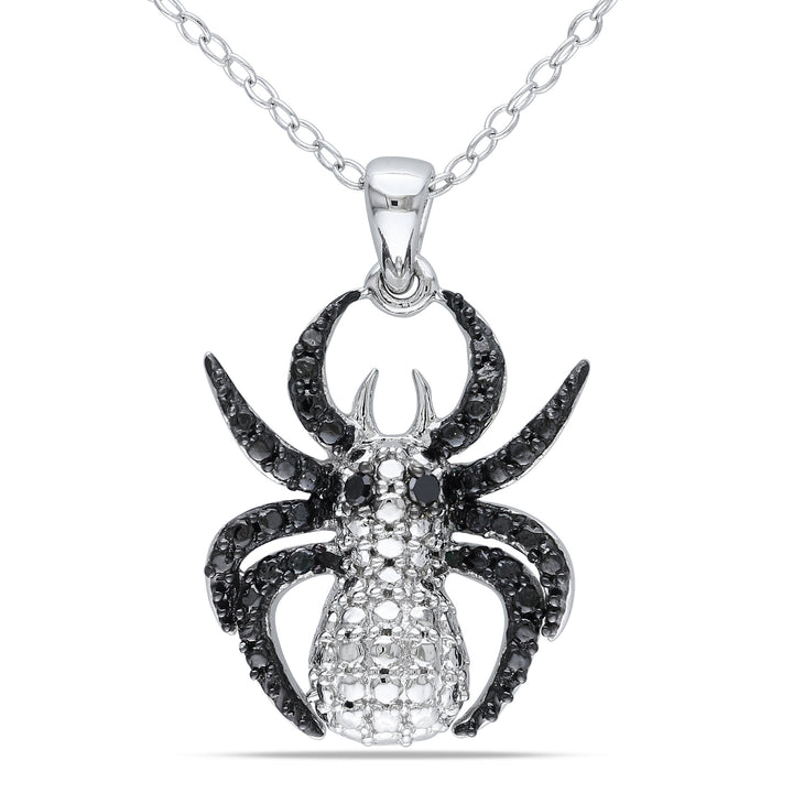 Crafted in sterling silver with black rhodium plating. Features black diamond accents (8 legs and 2 eyes). Necklace length: 18 inches with spring ring clasp.