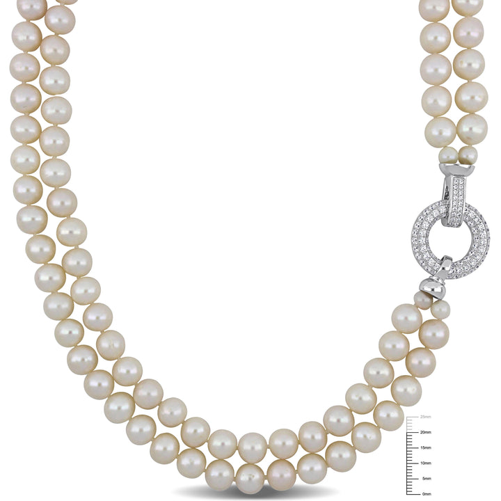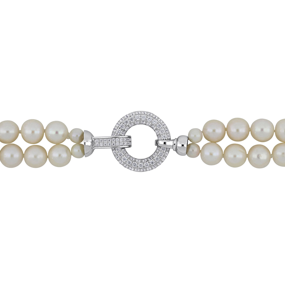 Crafted in sterling silver with round 7–8mm freshwater cultured pearls. Length 16 & 17 inches. Secured with cubic zirconia enhancer clasp.