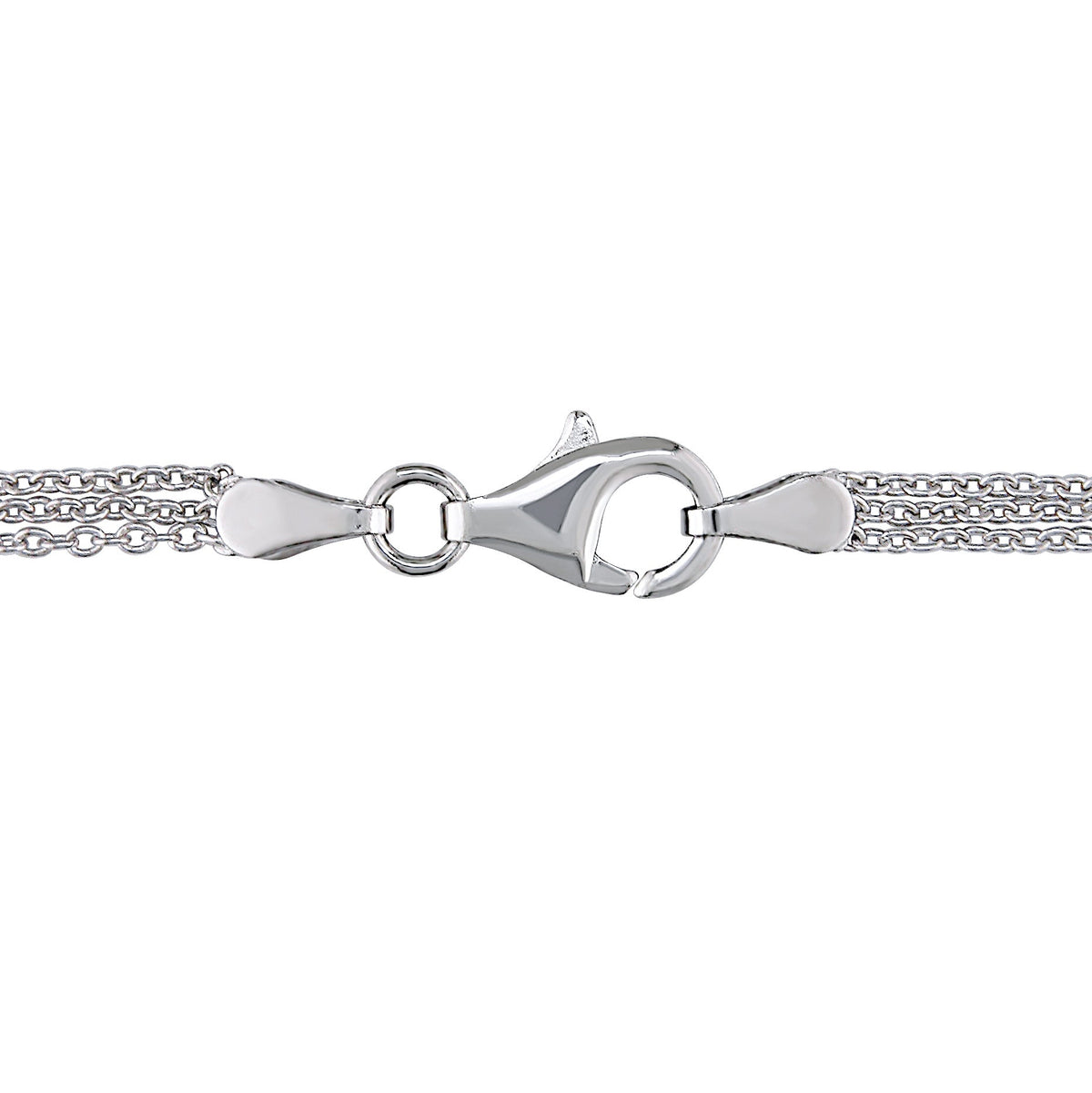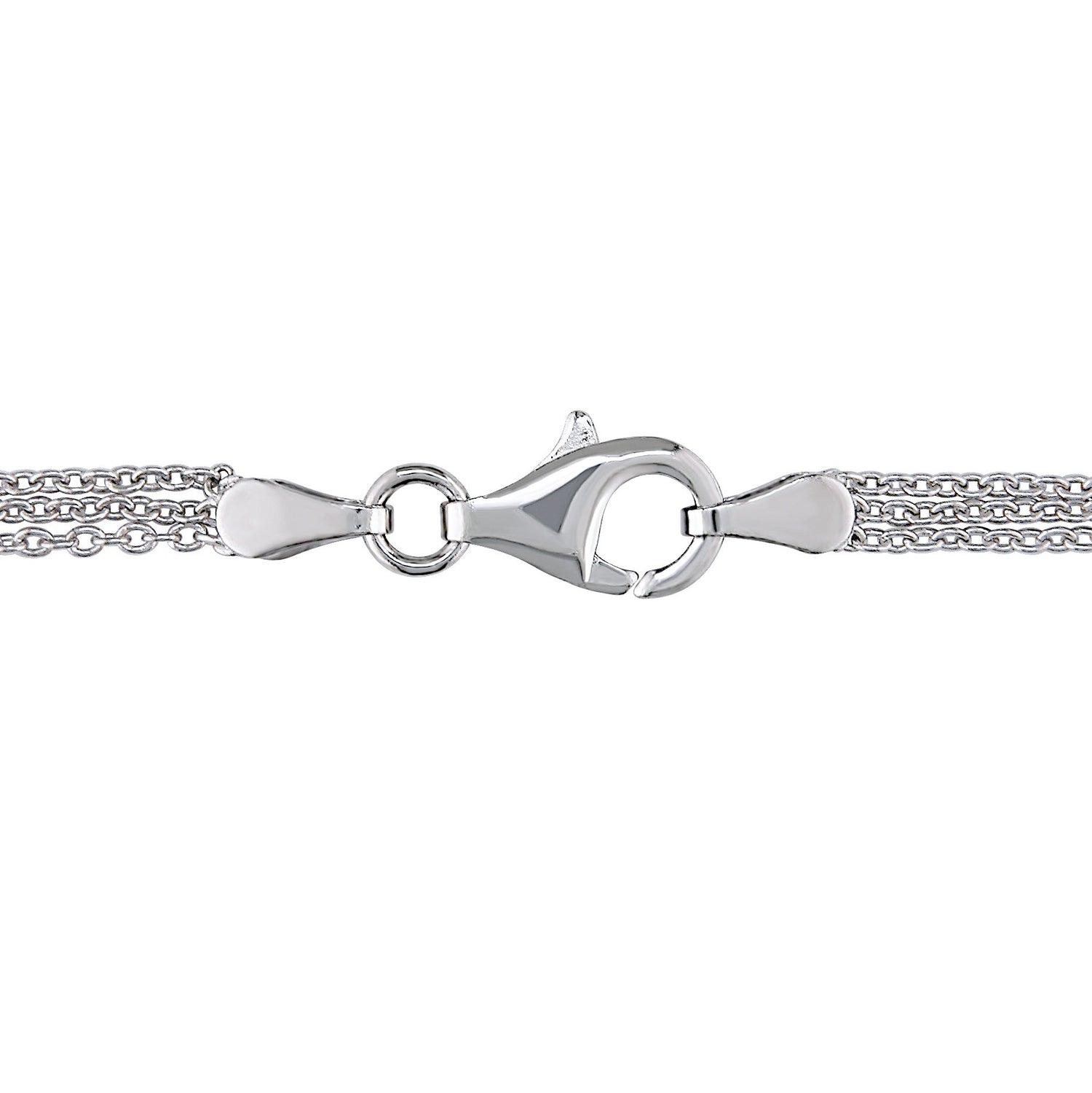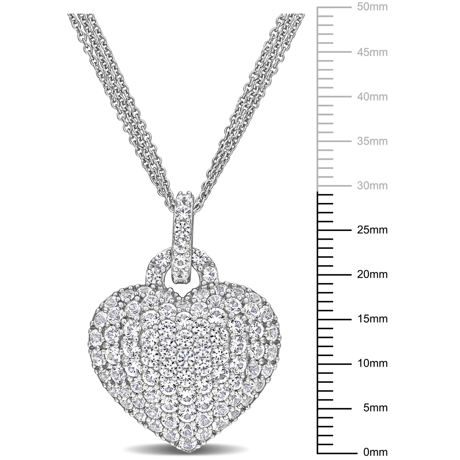 Sterling silver with 62 round-cut (2mm) and 33 round-cut (1.75mm) created white sapphires. Pendant on a 17-inch triple-strand cable chain with lobster clasp.