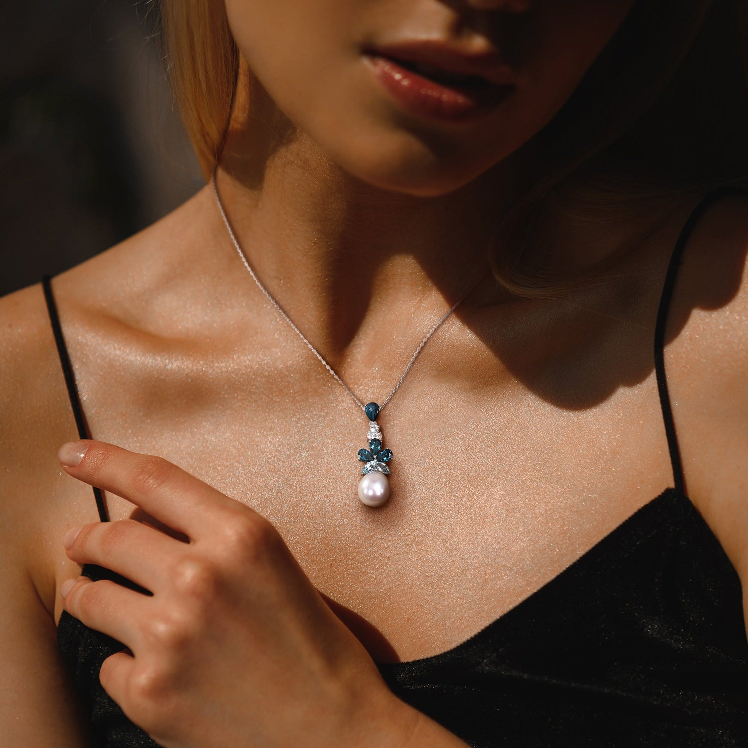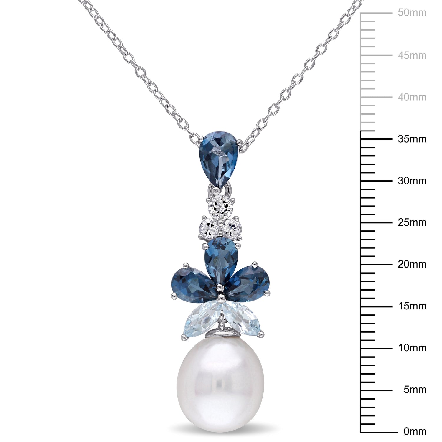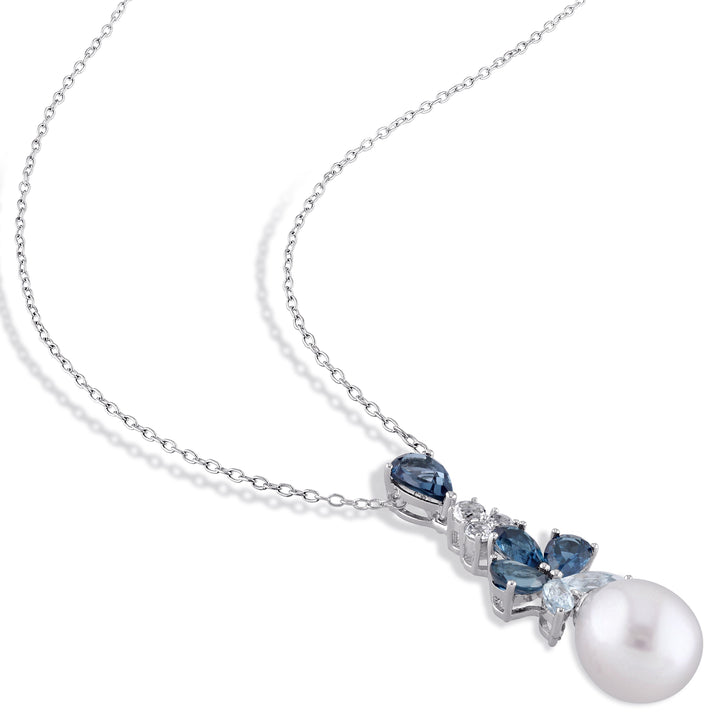 Crafted with a 9.5–10mm white freshwater cultured pearl, four pear-cut London blue topaz (7x5mm), two marquise-cut sky blue topaz (6x3mm), and two round-cut white topaz (2.5mm). Includes an 18-inch chain.