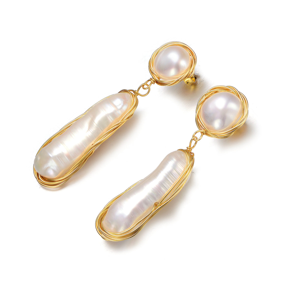 14k gold-plated sterling silver with genuine freshwater pearls. Length: 40mm. Butterfly backs.